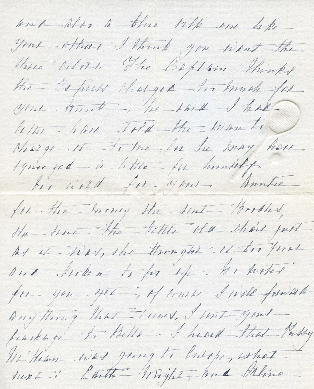 and also a blue silk one like yours and hers. I think you want the three colors. The Captain thinks the Express charged too much for your trunk, he said I had better have told the man to charge it to me, for he may have squeezed a little for himself. I'm wired for your Auntie for the money she sent. Besides, she sent the little Ala shirt just as it was, she thought it too fine and broken to fix up. I acted for you yet, of course I will forward anything that comes. I sent your package to Belle. I heard that Pussy Mc'Kean was going to escape, what next? Edith Wright, and Orline