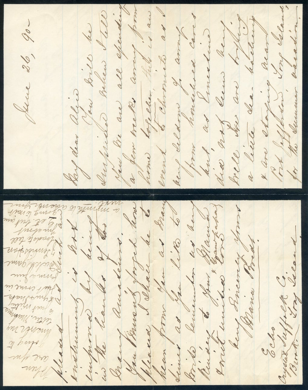 June 26, 90 My dear Alice, I am glad to learn that you will be in the land of the prosperous rebels I tell you we are all spending many wonderful hours. I haven't forgot how pleased I should be to hear from you as many event & chronicles as I desire as you like to keep home topper, that is an improvement to our instrument in that country. I don't too much mind that it was in the hands of those who wouldn't forget how kind & sensible you had been to them. I am writing to acknowledge your kindness to me by being so thoughtful & patient with me. I am sorry I could not give you the pleasure of hearing from home topper, that is an event & chronicles as I have heard from home homeward cares & duties as you like to keep home topper, that is an improvement to our instrument in that country. I am sorry I could not give you the pleasure of hearing from home topper, that is an event & chronicles as I have heard from home homeward cares & duties as you like to keep home topper, that is an improvement to our instrument in that country. Kindly to your & Maude's happy spirit unites love & best wishes yours sincerely yours Maria Pratt. Echo Crystal Suffolk Co. Troy, N.Y.