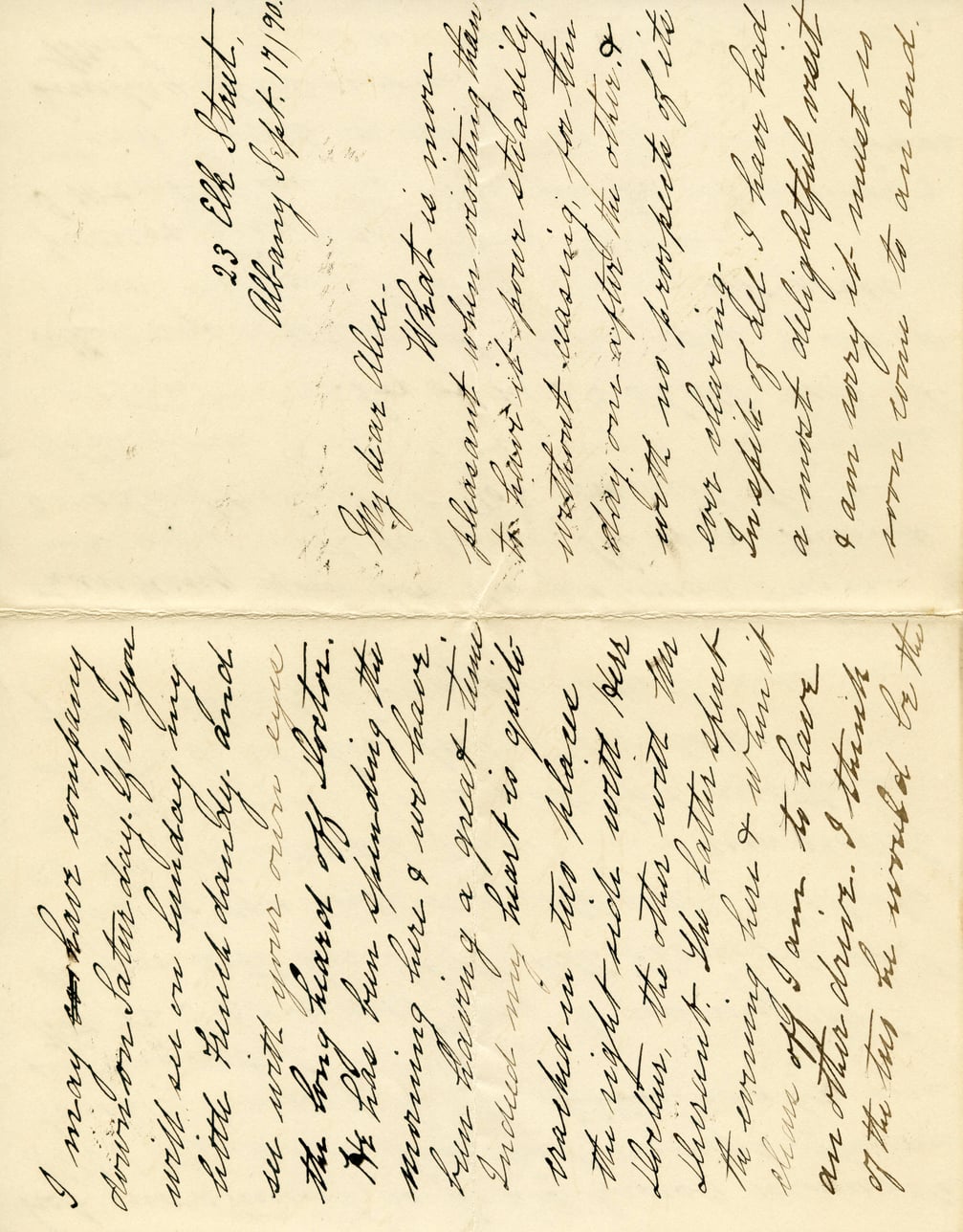 I may have company arriving later day. If so you will see me Sunday my little friend surely. And 23 Ell St. Albany Sept. 17/90. see with your own eyes the long list of dates. My dear Alex. I've been spending the morning here & we have been having a great time. Indeed my heart is quite watched on two places the night side with Rev. Mr. H. the other with the deacon. The latter shook me thoroughly this morn & when it cleared off I am to have an other cheer. I think of the day it would be the What is more pleasant when visiting than to think it's pour utterly without caring for the day one after the other. & In spite of all I have had a most delightful visit & am sorry it must go home home to an end.