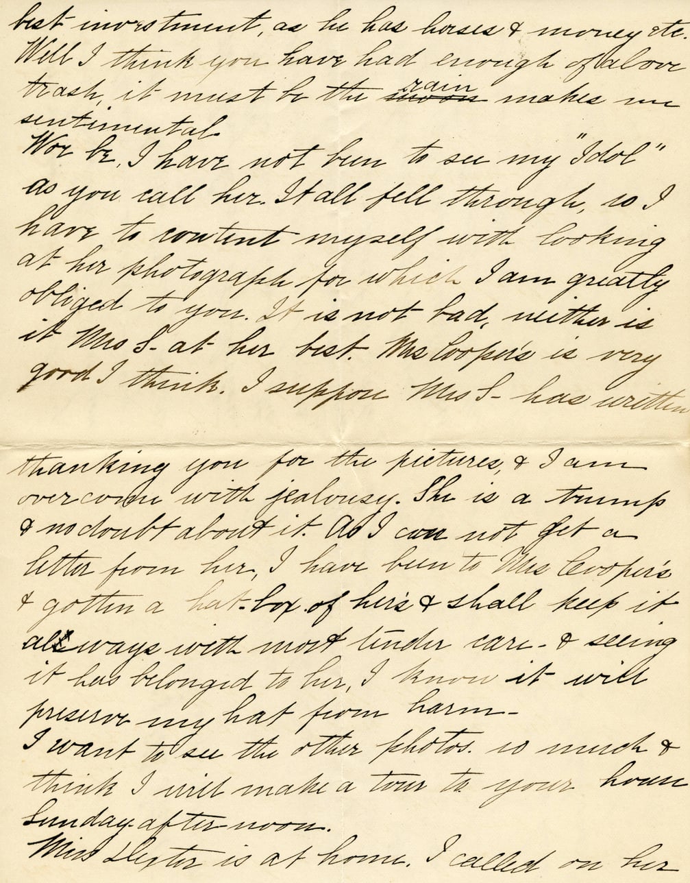 but investment, as he has horses & money etc. Will I think you have had enough of balour trash, it must be the rain makes me sentimental. Woe be, I have not been to see my "Idol" as you call her. It all fell through, so I have to content myself with looking at her photograph for which I am greatly obliged to you. It is not bad, neither is it Mrs S. at her best. Mrs Cooper's is very good I think. I suppose Mrs S. has written thanking you for the pictures, & I am overcome with jealousy. She is a trump & no doubt about it. As I can not get a letter from her, I have been to Mrs Cooper's & gotten a hat box of hers & shall keep it always with most tender care - & seeing it has belonged to her, I know it will preserve my hat from harm - I want to see the other photos so much & think I will make a tour to your house Sunday afternoon. Miss Slyter is at home. I called on her