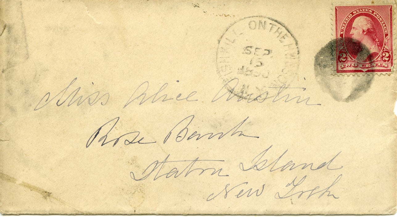 @file_pinax:file {title: "E.D. VanRensselaer Correspondence to Alice Austen", creator: @ed_vanrensselaer, institution: "Alice Austen House", created: @date_1890_09, language: "en", subjects: ["Correspondence","Photography","Family relationships","Social life","Victorian era"], description: "A collection of letters from E.D. VanRensselaer to Alice Austen in September 1890, discussing photography, family matters, and social life.", places: [@fishkill_on_hudson, @staten_island, @northfield, @sea_bright]}Miss Alice Austin Rose Banks Staton Island New York