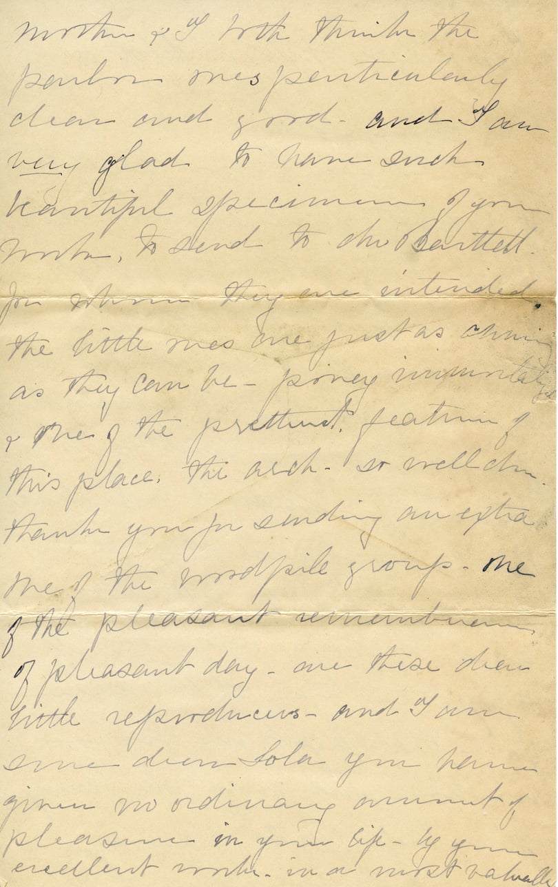 mother & I both think the parlor ones particularly clean and good—and I am very glad to have such beautiful specimens of your work, to send to Mrs. Bartlett for whom they are intended. The little ones are just as charming as they can be—poorly imitated & one of the prettiest features of this place, the arch—so well done. Thank you for sending an extra one of the woodpile group—one of the pleasant remembrances of pleasant day—are these dear little reproductions—and I am sure dear Lola you have given an ordinary amount of pleasure in your lip—by your excellent work—in a most valuable