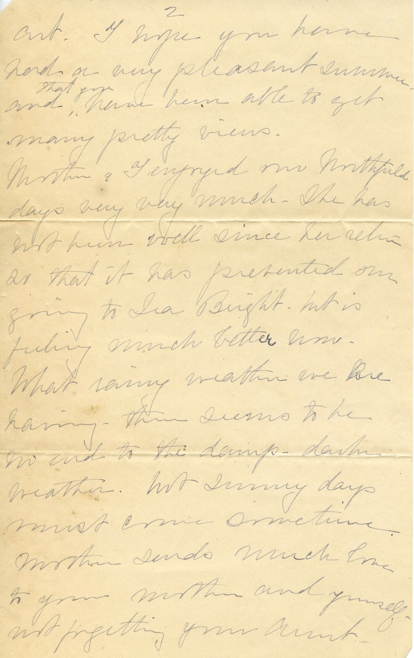 out. I hope you have had a very pleasant summer and that you have been able to get many pretty views. Mother & I enjoyed our Northfield days very very much. She has not been well since her return as that it has prevented our going to Sea Bright but is feeling much better now. What rainy weather we are having. There seems to be no end to the damp, dark weather. But sunny days must come sometime. Mother sends much love to your mother and yourself and forgetting your aunt.