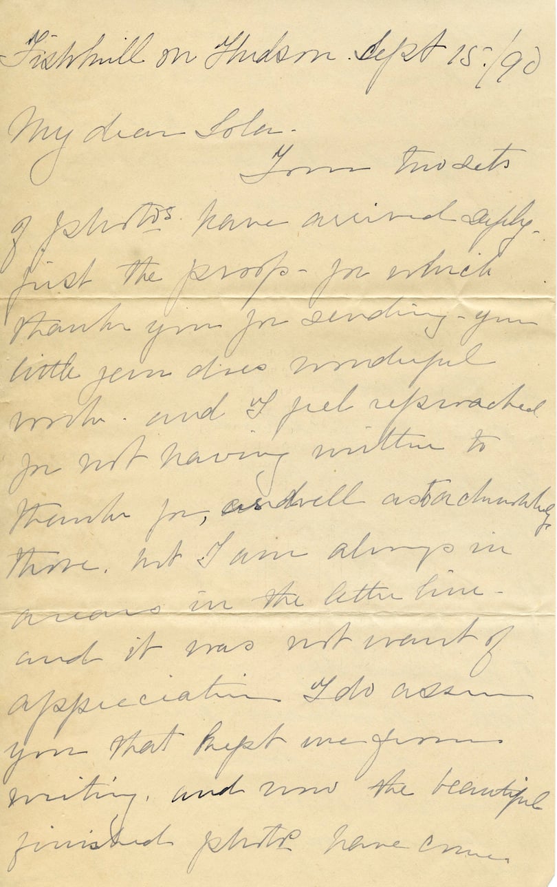 Fishkill on Hudson Sept 15, '90 My dear Soler, Your two sets of photos have arrived safely. Just the proofs for which thank you for sending—you little gem dies wonderful with—and I feel reproached for not having written to thank you, and will astonishingly those, but I am always in arrears in the latter time—and it was not want of appreciation. I do assure you that kept me from writing, and now the beautiful finished photos have come.
