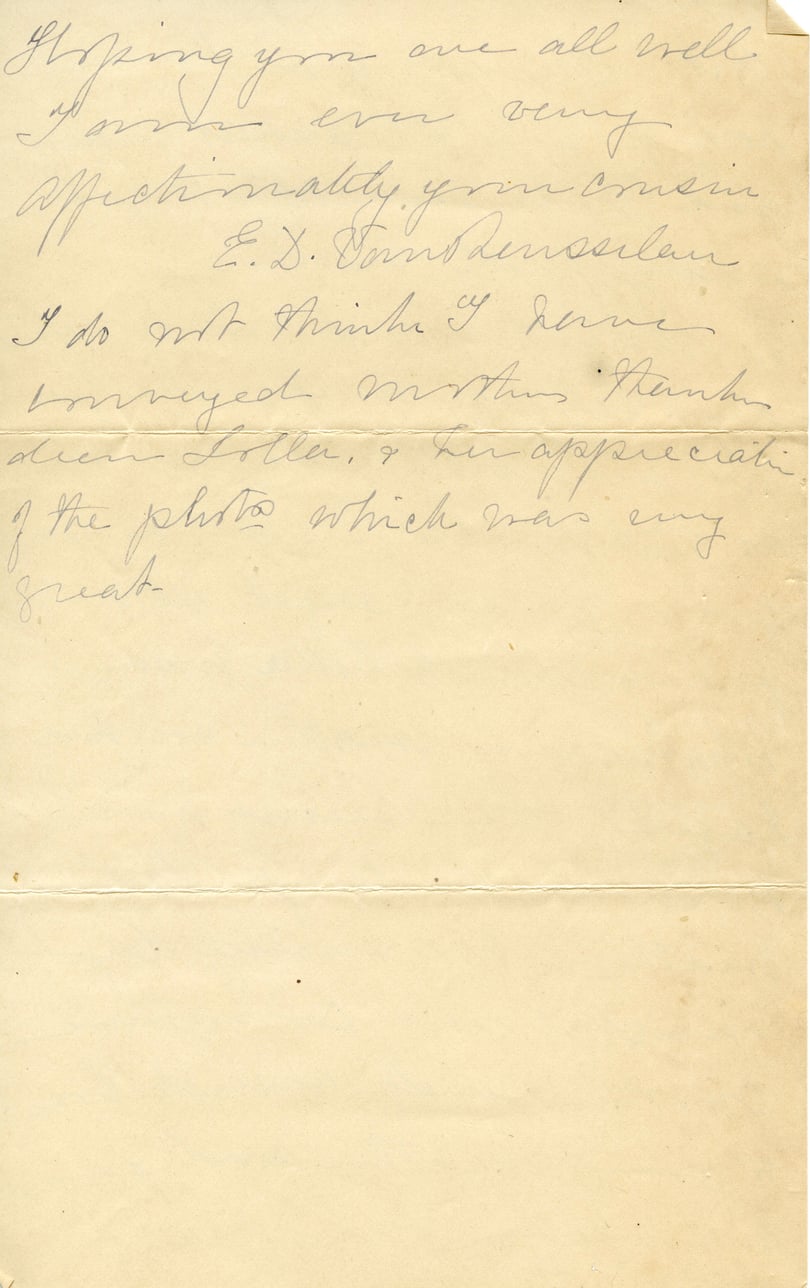 Hoping you are all well. I am ever very affectionately, your cousin E.D. VanDensselaer I do not think I have conveyed my thanks dear Lolla, & for appreciation of the photo which was very great.