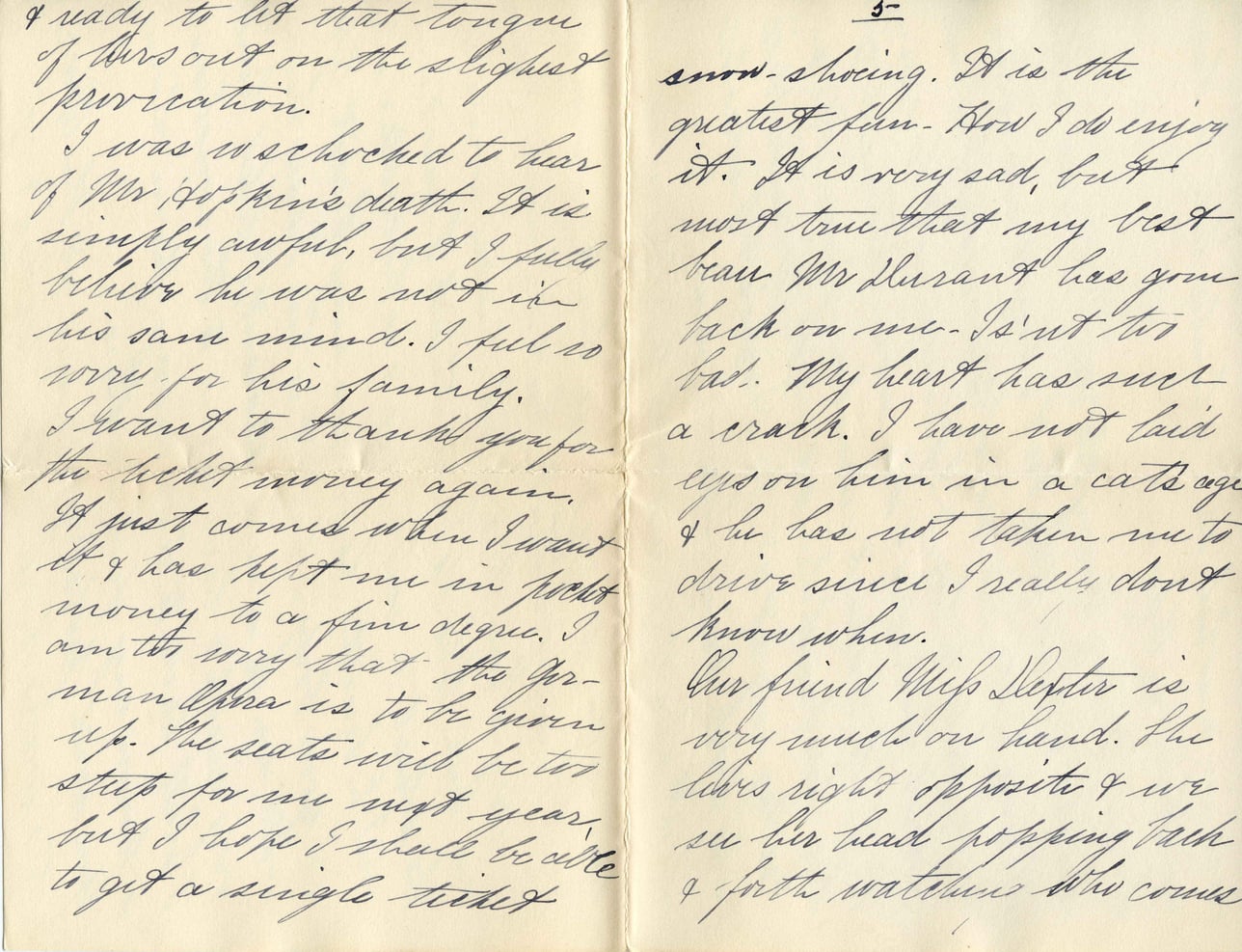 & ready to let that tongue of hers out on the slightest provocation. I was so shocked to hear of Mr. Hopkins's death. It is simply awful, but I fully believe he was not in his sane mind. I feel so sorry for his family. I want to thank you for the ticket money again. It just comes when I want it & has kept me in pocket money to a fine degree. I am too sorry that the German Opera is to be given up. The seats will be too steep for me next year, but I hope I shall be able to get a single ticket snow-shoeing. It is the greatest fun. How I do enjoy it. It is very sad, but most true that my best man Mr. Durant has your back on me. Isn't too bad. My heart has such a crack. I have not laid eyes on him in a cat's age & he has not taken me to drive since I really don't know when. Our friend Miss Lester is very much on hand. She lives right opposite & we see her head popping back & forth watching who comes