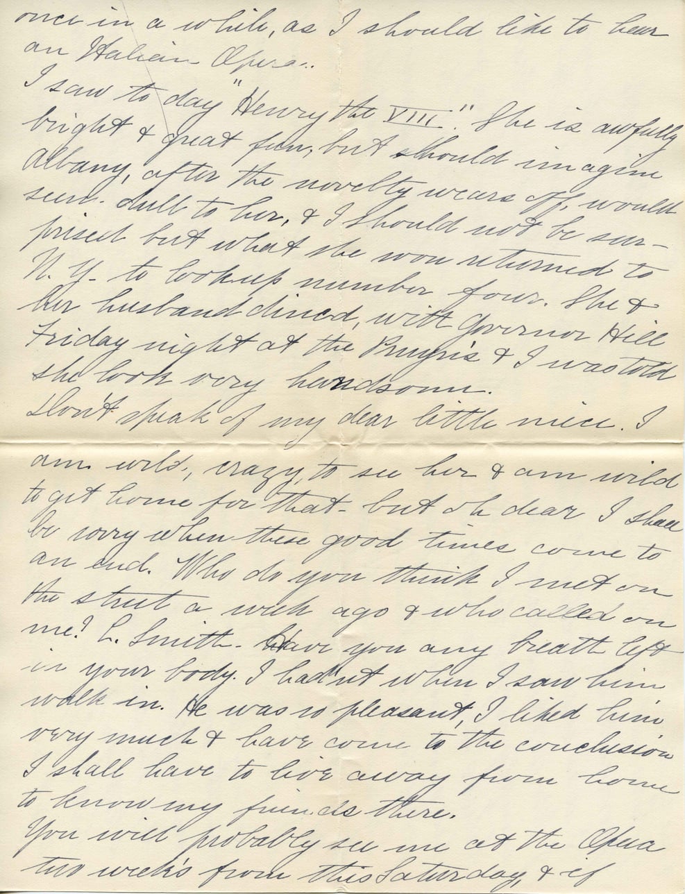 once in a while, as I should like to hear an Italian Opera. I saw today "Henry the VIII." She is awfully bright & great fun, but I should imagine Albany, after the novelty wears off, would send dull to her, & I should not be surprised but what she soon returned to N.Y. to look up number four. She & her husband dined with Governor Hill Friday night at the Murphy's & I was told she looks very handsome. Don't speak of my dear little niece. I am wild, wazy, to see her & am wild to get home for that—but oh dear I shall be sorry when these good times come to an end. Who do you think I met on the street a week ago & who called on me? L. Smith—Have you any breath left in your body I hadn't when I saw him walk in. He was so pleasant, I liked him very much & have come to the conclusion I shall have to live away from home to know my friends there. You will probably see me at the Opera two weeks from this Saturday & if