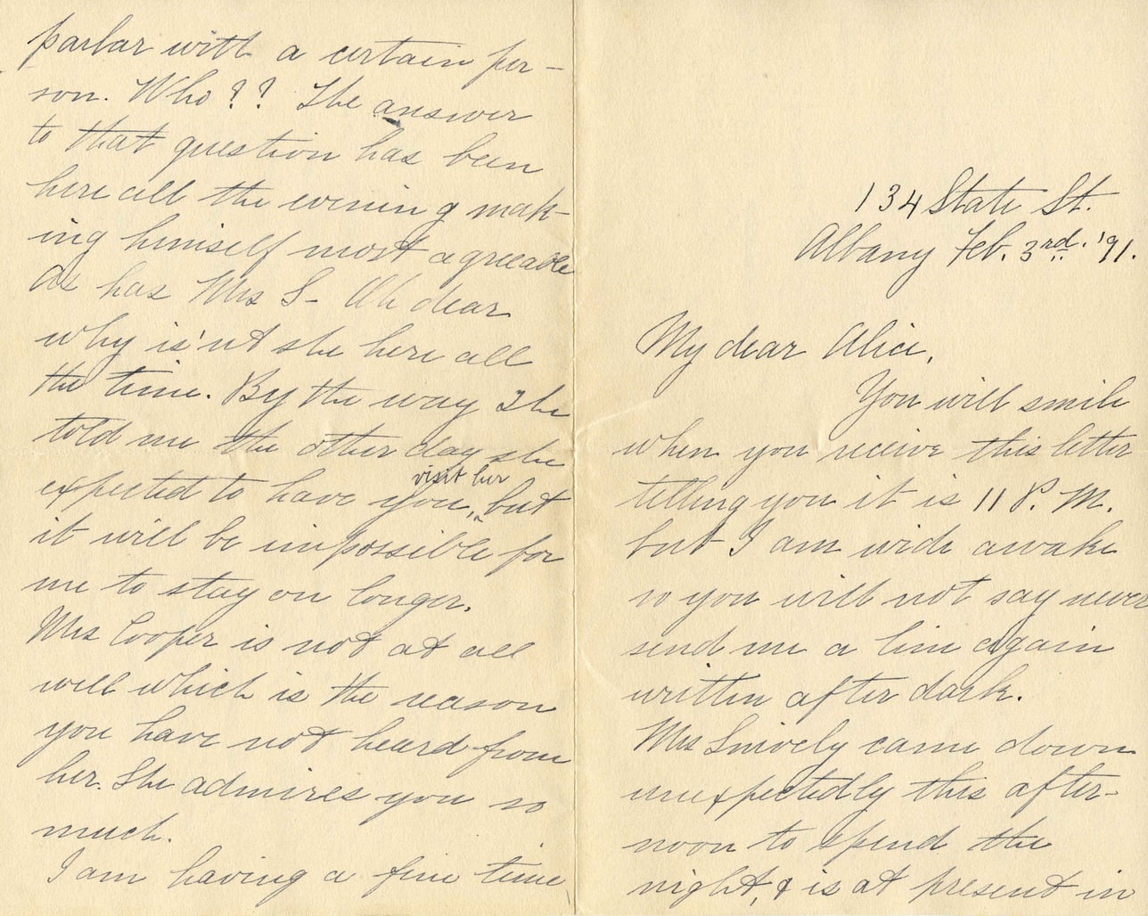 @date_1891_02_03parlar with a certain per- son. Who? The answer to that question has been here all the evening making himself most agreeable has Mrs S. Oh dear why is not she here all the time. By the way I've told her the other day she expected to have you visit her but it will be impossible for me to stay on longer. Mrs Cooper is not at all well which is the reason you have not heard from her. She admires you so much. I am having a fine time 134 State St. Albany Feb. 3rd '91. My dear Alice, You will smile when you receive this letter telling you it is 11 P.M. but I am wide awake so you will not say never send me a line again written after dark. Mrs Smively came down unexpectedly this afternoon to spend the night, & is at present in