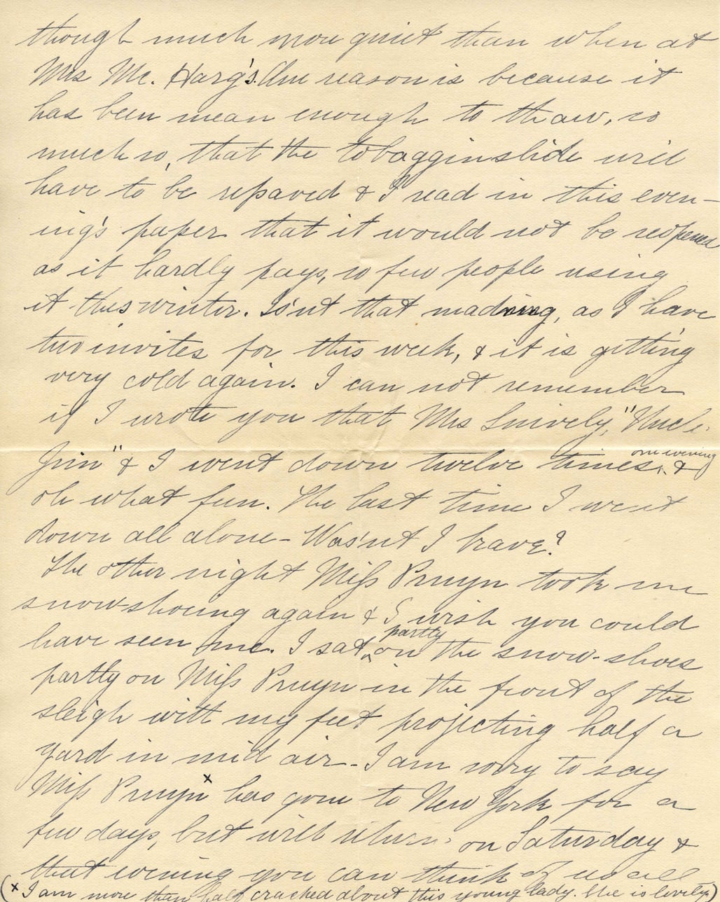 though much more quiet than when at Mrs. Mr. Harg's. The reason is because it has been mean enough to thaw, so much so, that the toboggan slide will have to be repaired & I read in this evening's paper that it would not be useless as it hardly pays, so few people using it this winter. Isn't that maddening, as I have two invites for this week, & it is getting very cold again. I can not remember if I wrote you that Mrs. Lively "Huck, Join" & I went down twelve times on evening oh what fun. The last time I went down all alone—Wasn't I brave? The other night Miss Prugh took me snow-shoeing again & I wish you could have seen me. I sat partly on the snow-shoes partly on Miss Prugh—in the front of the sleigh with my feet projecting half a yard in mid air—I am sorry to say Miss Prugh has gone to New York for a few days, but will return on Saturday & that evening you can think of us all. (I am more than half cracked about this young lady. She is lovely.)