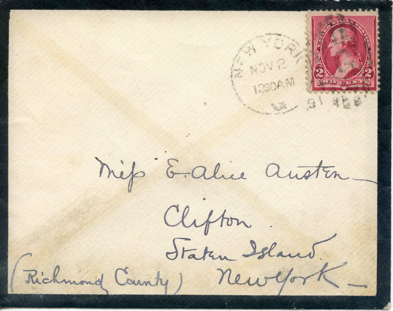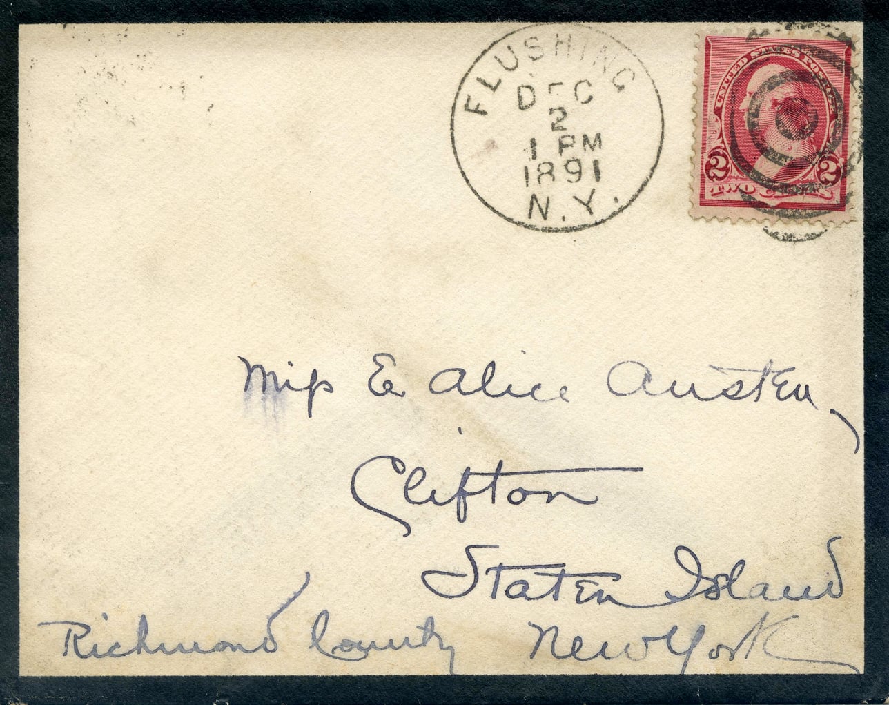 FLUSHING DEC 2 1 PM 1891 N.Y. Miss E Alice Austin, Clifton Staten Island Richmond County, New York
