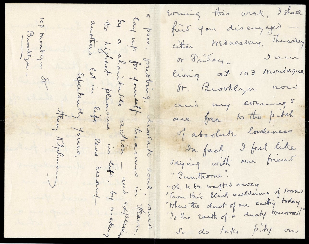 @file_1891_12_2_henry_gilman_dec_2_1891003_copy_jpg -> documents -> @letter_dec_2_1891a poor, grubbing, dissolute soul, and lay up for yourself treasures in Heaven by a charitable action—and experience the highest pleasure in life, by making another's lot in life less misery. Expectancy yours, Henry H. Gilman 103 Montague St. Brooklyn— Evening this week, I shall find you disengaged—either Wednesday, Thursday or Friday—I am living at 103 Montague St. Brooklyn now and any evenings are free to the pitch of absolute loneliness. In fact I feel like saying with our friend "Bunthorne": "Oh to be wafted away From this black aceldama of sorrow Where the dust of an earthy today Is the earth of a dusty tomorrow!" So do take pity on