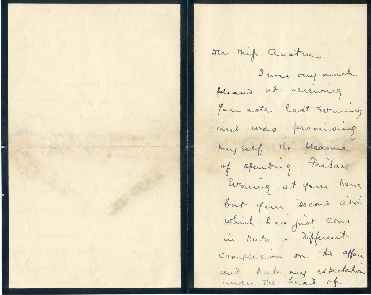 Dear Miss Austen, I was very much pleased at receiving your note last evening and was promising myself the pleasure of spending Friday evening at your house but your "second edition" which has just come in puts a different complexion on the affair and puts my expectation under the heat of