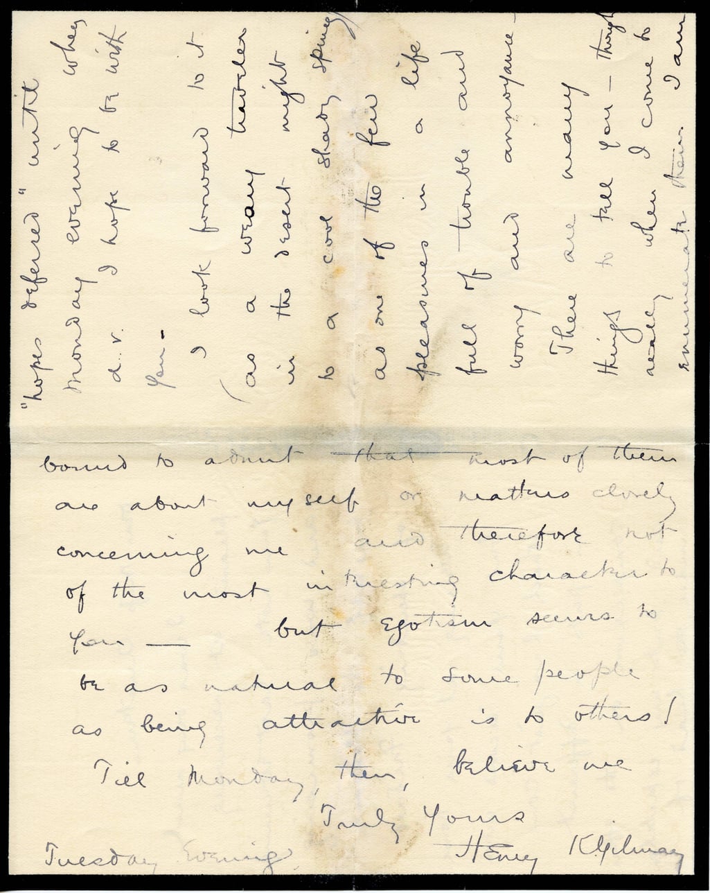 "Hopes deferred" until Monday evening. A.V. I hope to go with you— I look forward to it (as a weary traveler in the desert might to a cool shady spring) as one of the few pleasures in a life full of trouble and worry and annoyance. There are many things to thee you—though when I come to see you, I am sure I am bound to admit that most of them are about myself or matters closely concerning me and therefore not of the most interesting character to you—but egoism seems to be as natural to some people as being attractive is to others! Till Monday, then, believe we Truly yours, Henry Kilgway
