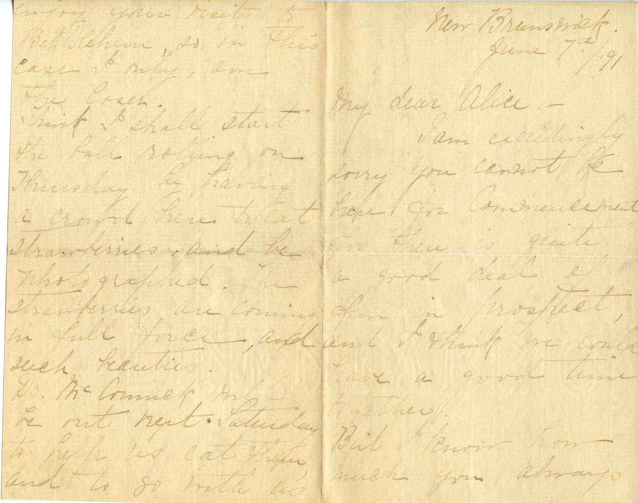 @letter_1891_06_07_2 -> part of -> @collection_elizabeth_b_thong_correspondenceEnjoy your visit to Bethlehem, as in this case & only, am the guest. Nick & I shall start the fall rolling on Thursday by having a cropful here to eat strawberries, and be photographed. The strawberries are coming in full force, and such quantities. Dr. McConnell will be out next Saturday to help us eat them, and to go with us. New Brunswick June 7th '91 My dear Alice— I am exceedingly sorry you cannot be here for Commencement. In New Brunswick is quite a good deal of fun in prospect, and I think we could have a good time together. But I know how much you always