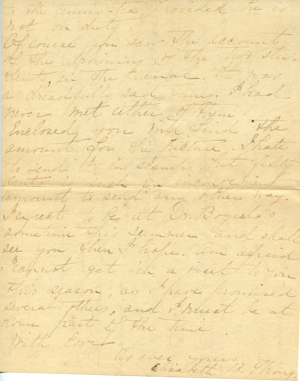 to the tennis-tennis provided he is not on duty. Of course you saw the account of the drowning of the two students, in The Canal. It was a dreadfully sad thing. I had never met either of them. Enclosed you will find the amount for the picture. I hate to send it in stamps, but fifty cents is such an inconvenient amount to send any other way. I expect to be at Dr. Boyce's sometime this summer and shall see you then I hope. Am afraid cannot get in a visit to you this season, as I have promised several others, and I must be at home part of the time. With love, As ever yours, Elizabeth B. Thong