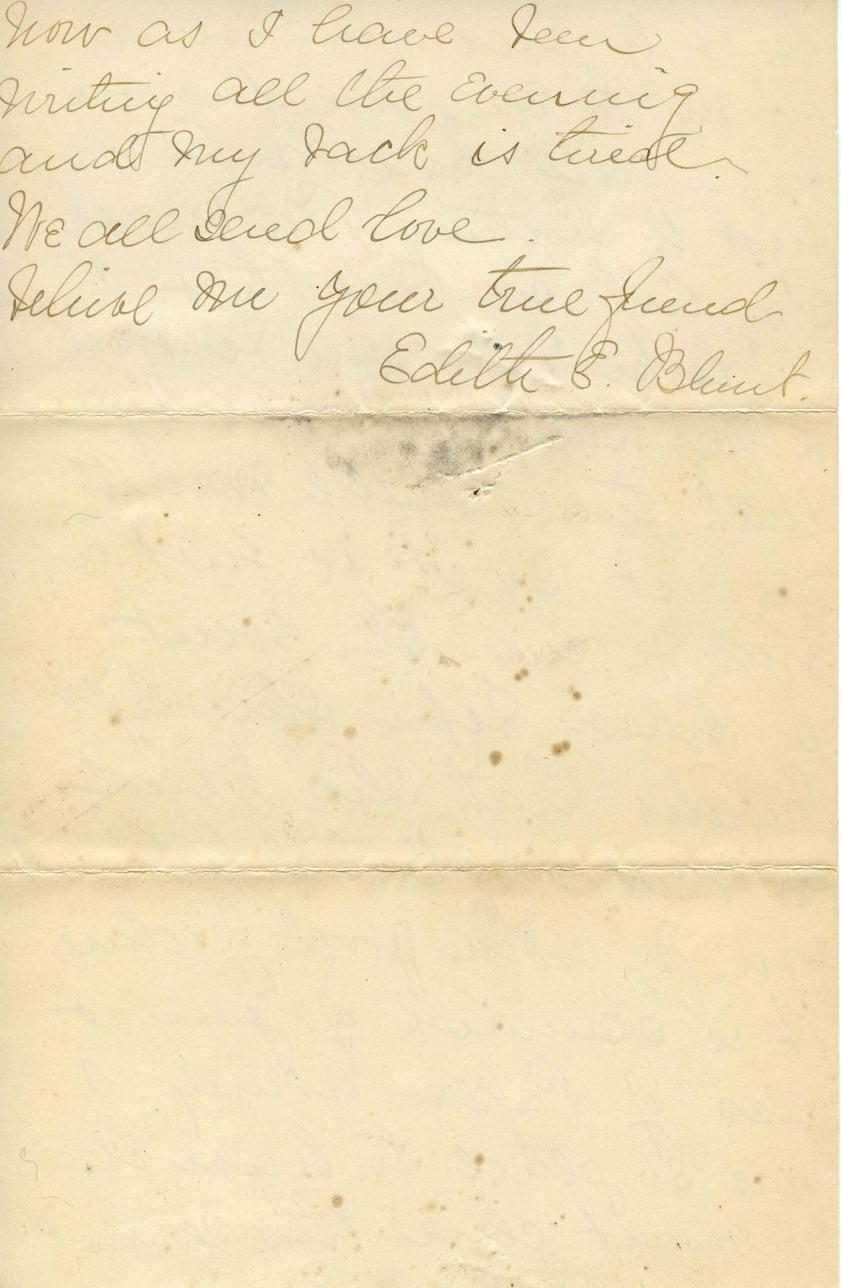 Now as I have been writing all the evening and my back is tired. We all send love. Believe me your true friend, Edith E. Blunt.
