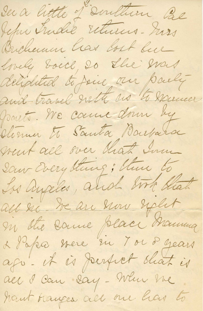 In a little of Southern Cal before Frankie returns, Mrs. Bricheanu has lost her lovely voice, so she was delighted to join our party and travel with us to Warner Gerts. We came down by Steamer to Santa Barbara, went all over that town, saw everything; thence to Los Angeles, and took that all in. We are now right in the same place Mamma & Papa were in 7 or 8 years ago. It is perfect that it all I can say. When we want changes all one has to