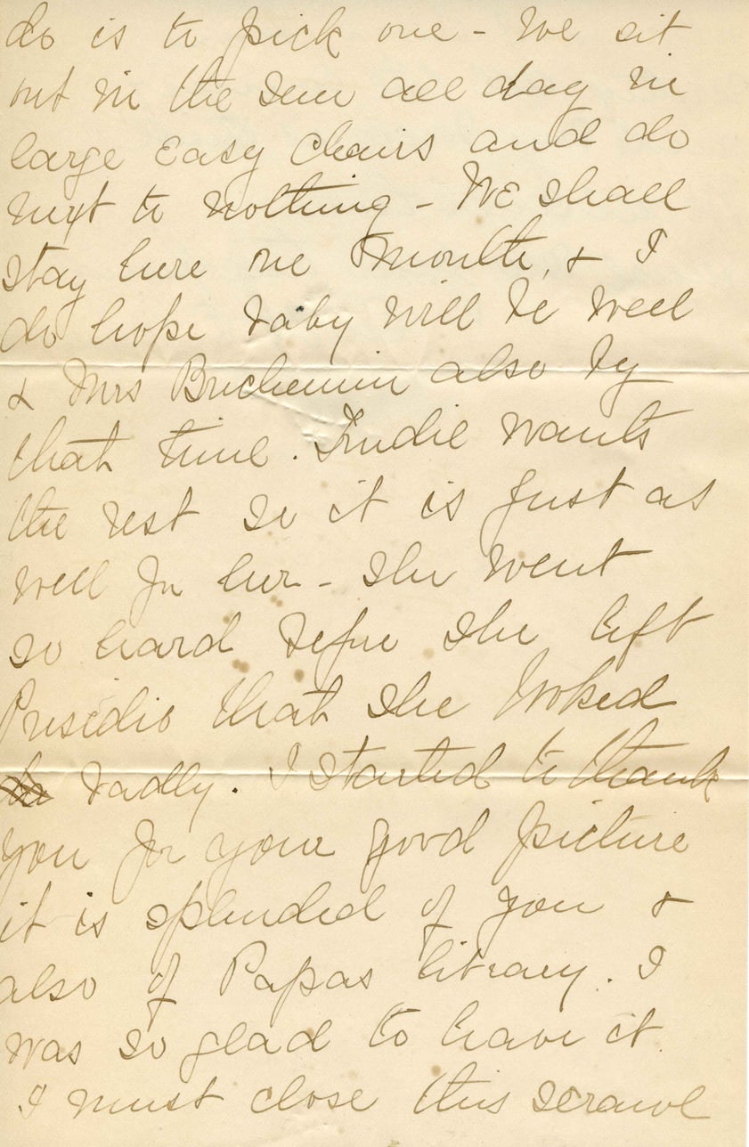 Do is to pick one - we sit out in the sun all day in large easy chairs and do next to nothing - We shall stay here one month, & I do hope Daisy will be well & Mrs. Buchanan also by that time. Indie wants the rest & it is just as well in her - she went so hard before she left Presidio that she looked so badly. I started to thank you for your good picture it is splendid of you & also of Papas library. I was so glad to have it. I must close this scrawl