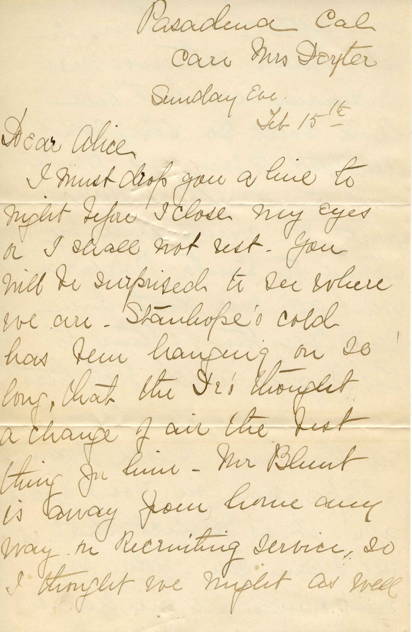 @letter_1891_feb_15_1:document {author: @edith_blunt, recipient: @alice_austen, date: @date_1891_02_15, location: @pasadena, content: "Dear Alice, I must drop you a line to night before I close my eyes or I shall not rest. You will be surprised to see where we are. Stanhope's cold has been hanging on so long, that the Dr's thought a change of air the best thing for him. Mr. Blunt is away from home away way in Recruiting Service, so I thought we might as well"}