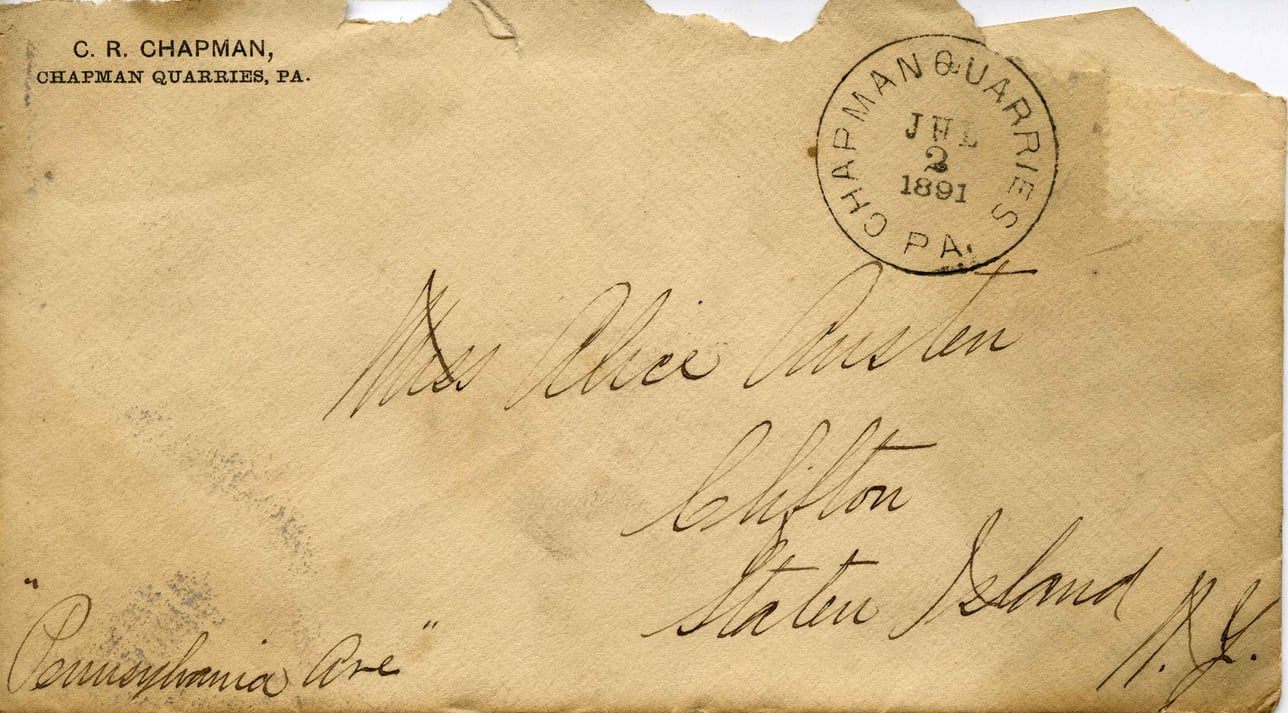 @letter_1891_07_02_fla -> mentions -> @paper_weight:concept {status: "in progress"}C. R. CHAPMAN, CHAPMAN QUARRIES, PA. Miss Alice Preston Clifton Staten Island N.Y. Pennsylvania Ave CHAPMAN QUARRIES JUL 2 1891 PA.