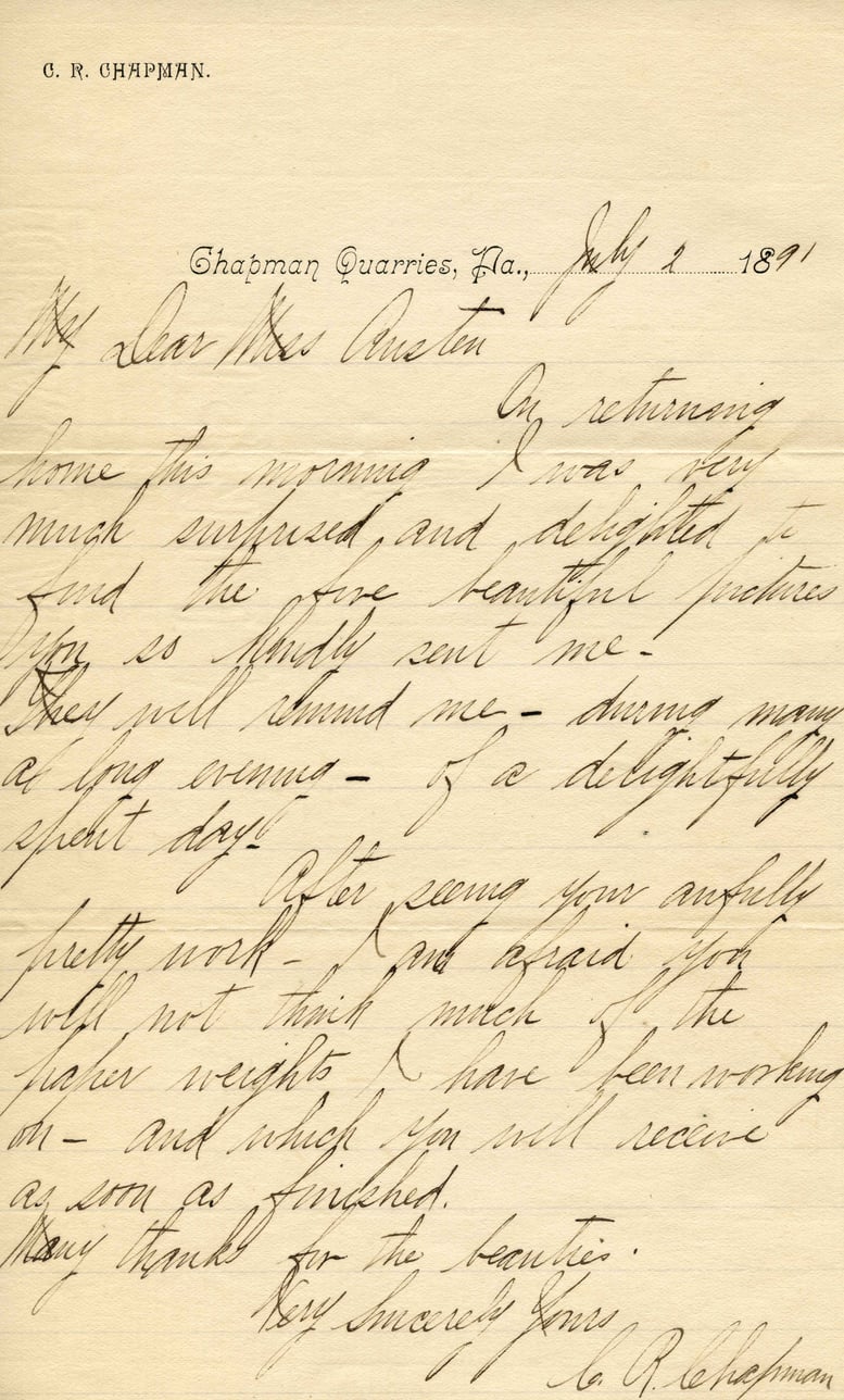 C. R. CHAPMAN. Chapman Quarries, Fla., July 2, 1891 My dear Mrs. Austin, On returning home this morning I was very much surprised and delighted to find the five beautiful pictures you so kindly sent me. They will adorn me—during many a happy evening—of a delightfully spirit day! After seeing your anxiously pretty work—I am not afraid you will not think much of the paper weight I have been working on—and which you will receive as soon as finished. Many thanks for the beauties. Very sincerely yours, C. R. Chapman