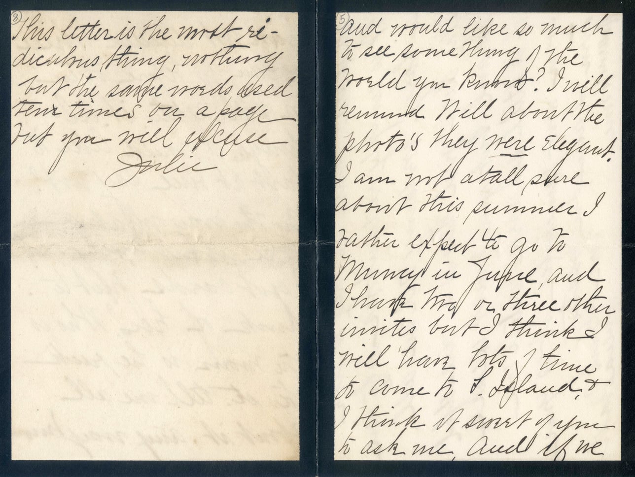 This letter is the most ridiculous thing, nothing but the same words used ten times on a page but you will see. Julie and would like so much to see something of the world you know? I will remind Will about the photos they were elegant. I am not at all sure about this summer I rather expect to go to Munich in June, and I have two or three other invites but I think I will have lots of time to come to England, & I think it smart of you to ask me, and if we