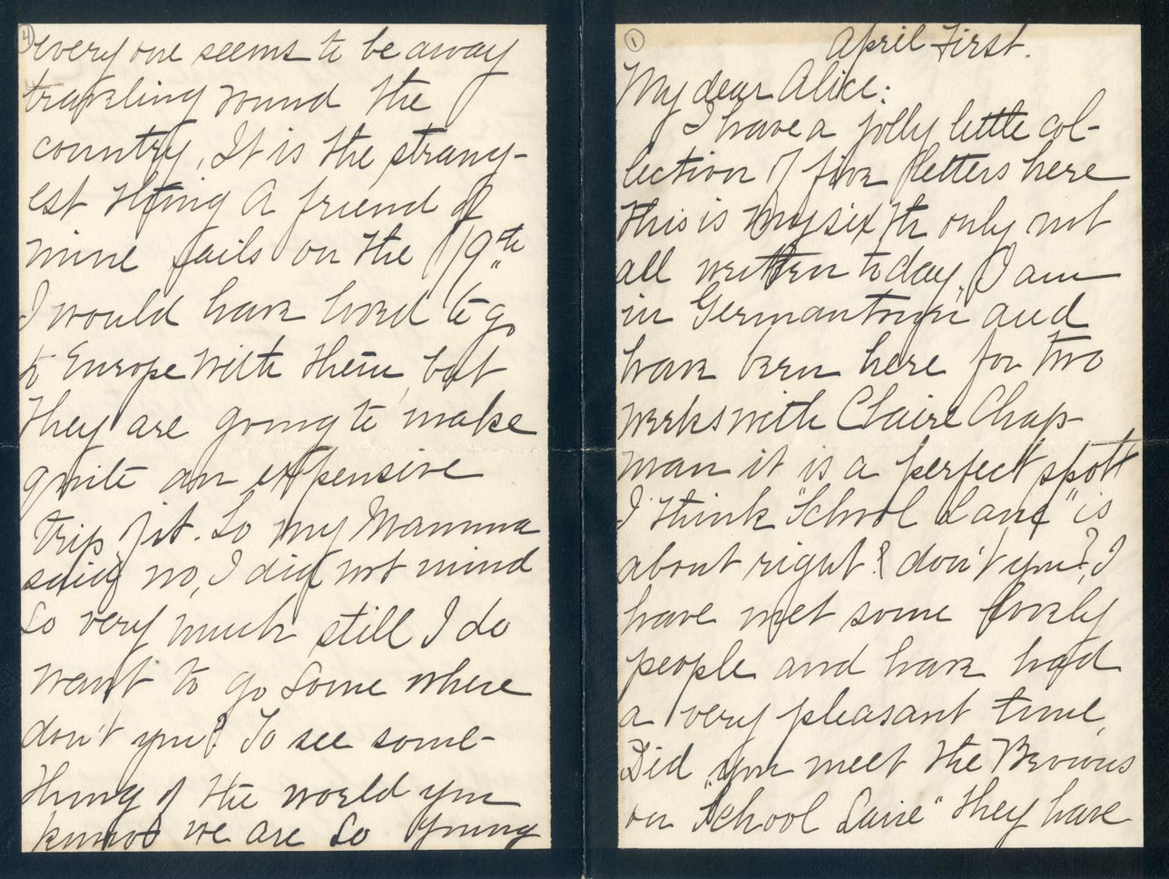 @alice_austen -> received letters from -> @bessie_strong:person {full_name: "Bessie Strong", relationship: "correspondent"}Every one seems to be away traveling round the country. It is the strangest thing a friend of mine fails on the 19th. I would have loved to go to Europe with them, but they are going to make a little and expensive trip it. So my Mamma said no, I did not mind so very much still I do want to go somewhere don't you? To see something of the world you know we are so young. April First. My dear Alice: I have a jolly little collection of five letters here. This is only the sixth out of all written today. I am in Germantown and have been here for two weeks with Claire Chapman. It is a perfect spot. I think "school lane" is about right? Don't you? I have met some lovely people and have had a very pleasant time. Did you meet the Browns on School Lane? They have