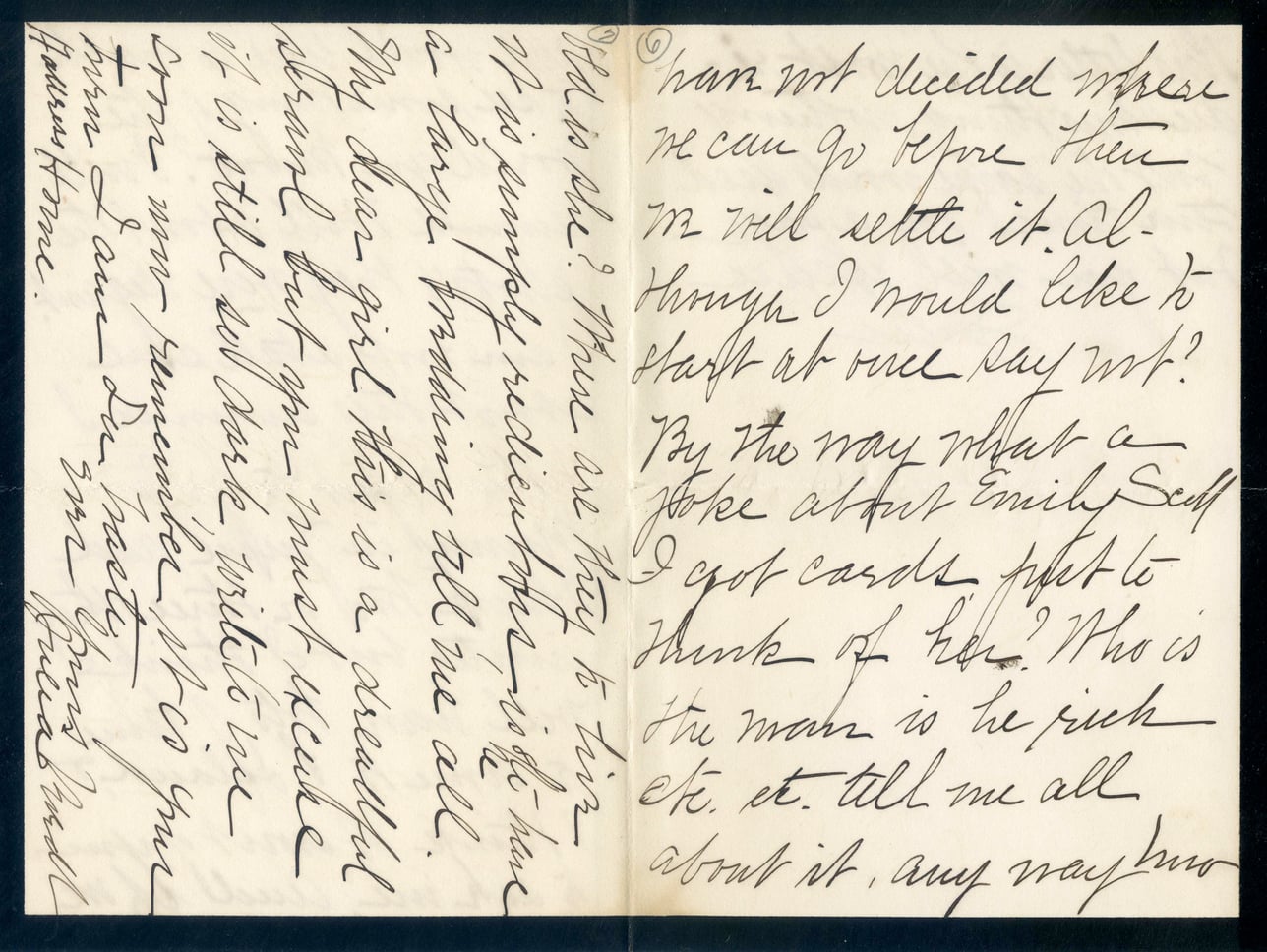 I have not decided where we can go before then we will settle it. Although I would like to start at once say not? By the way what a joke about Emily Scott I got cards just to think of her? Who is the man is he rich etc. etc. tell me all about it, any way how Who is she? Where are they to live? We so simply ridiculous might have a large problem till me all. My dear girl this is a dreadful account but you must recollect it is still in dark with me. Ever more remember who is your From I am Dr. Pratt Ever Yours Truly Anna Halloway
