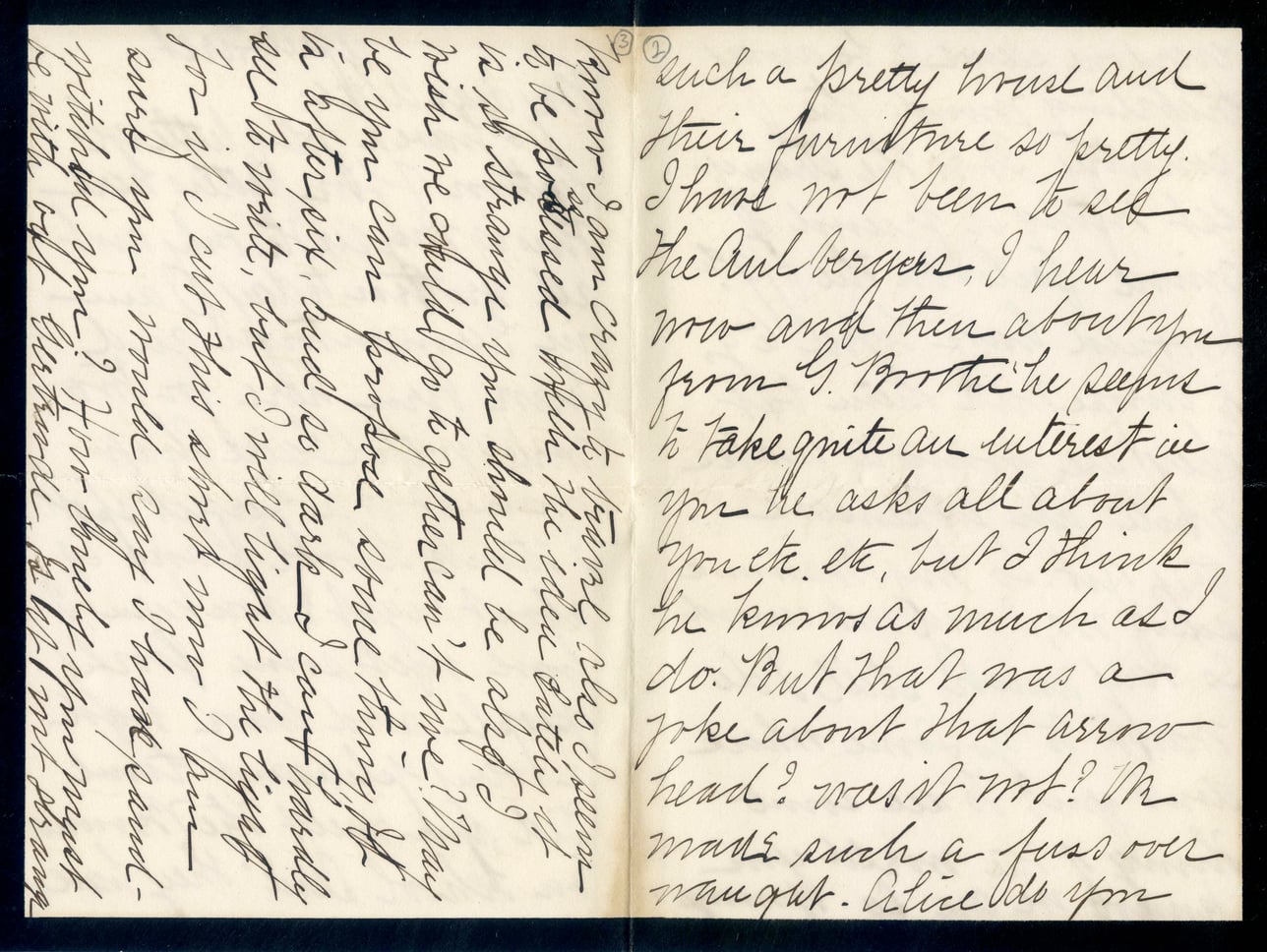 Such a pretty house and their furniture so pretty. I have not been to see the Aubergers, I hear now and then about you from G. Brother he seems to take quite an interest in you he asks all about you etc. etc., but I think he knows as much as I do. But that was a joke about that arrow head? wasn't it? We made such a fuss over it. Alice Do you want you would say I have said withold you? How truly you must be with all. Nevertheless, to let you strange