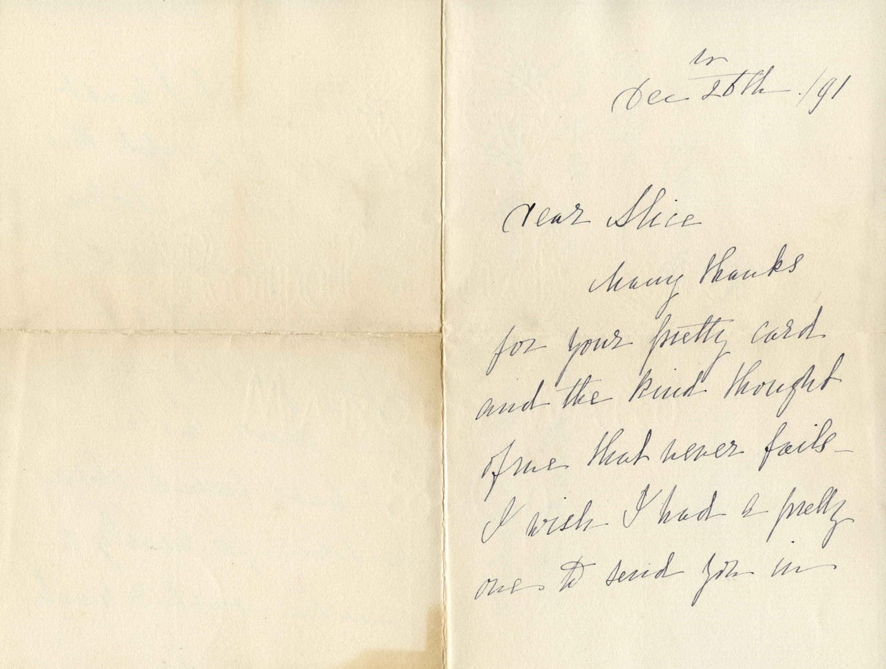 On Dec 25th /91 Dear Alice, Many thanks for your pretty card and the kind thought of me that never fails. I wish I had a pretty one to send you in.