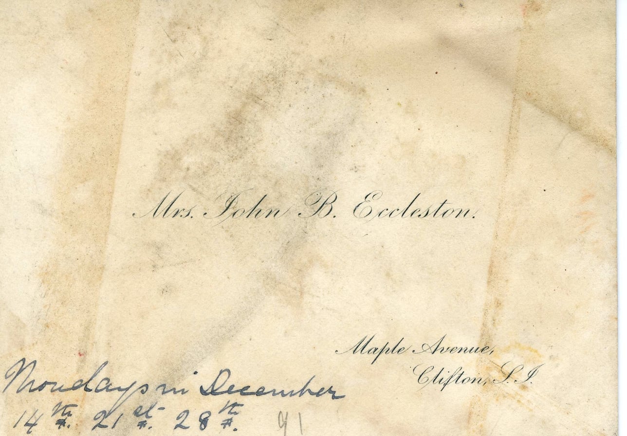 Mrs. John B. Eccleston. Maple Avenue, Clifton, S.I. Mondays in December 14th, 21st, 28th, 91