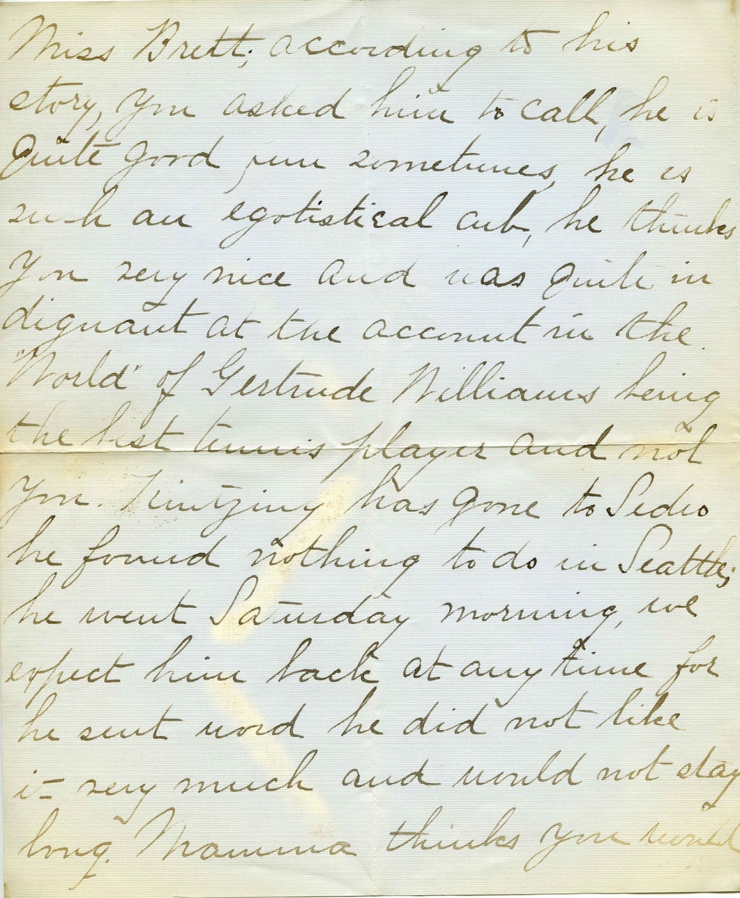 Miss Brett, according to his story, you asked him to call, he is quite good sometimes, he is such an egotistical cub, he thinks you very nice and was quite indignant at the account in the "World" of Gertrude Williams being the best tennis player and not you. Tiny has gone to Sedro he found nothing to do in Seattle; he went Saturday morning, we expect him back at any time for he sent word he did not like it very much and would not stay long. Mamma thinks you would
