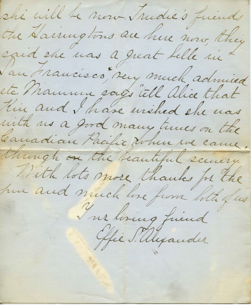 She will be now. Trudie's friends the Haringtons are here now, they said she was a great belle in San Francisco, very much admired etc. Maumma says 'til Alice that Kin and I have wished she was with us a good many times on the Canadian Pacific when we came through on the beautiful scenery. With lots more thanks for the fun and much love from both of us Your loving friend Effie S. Alexander