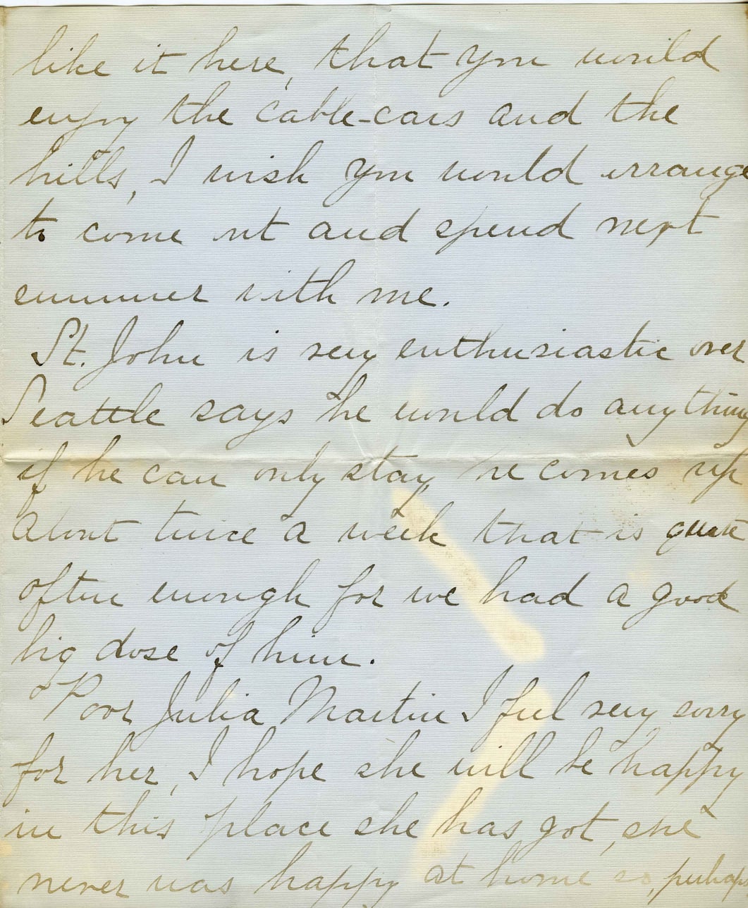 like it here, that you would enjoy the cable-cars and the hills, I wish you would arrange to come out and spend next summer with me. St. John is very enthusiastic over Seattle says he would do anything if he can only stay here comes up about twice a week that is quite often enough for we had a good big dose of him. Poor Julia Martin I feel very sorry for her, I hope she will be happy in this place she has got, she never was happy at home so perhaps