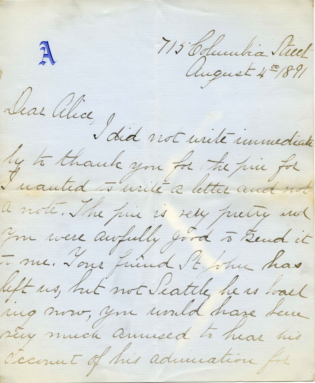 @date_1891_08_04715 Columbia Street August 4th, 1891 Dear Alice, I did not write immediately to thank you for the pie for I wanted to write a letter and not a note. The pie is very pretty and you were awfully good to send it to me. Your friend St. John has left us, but not Seattle he is sailing now, you would have been very much amused to hear his account of his admiration for