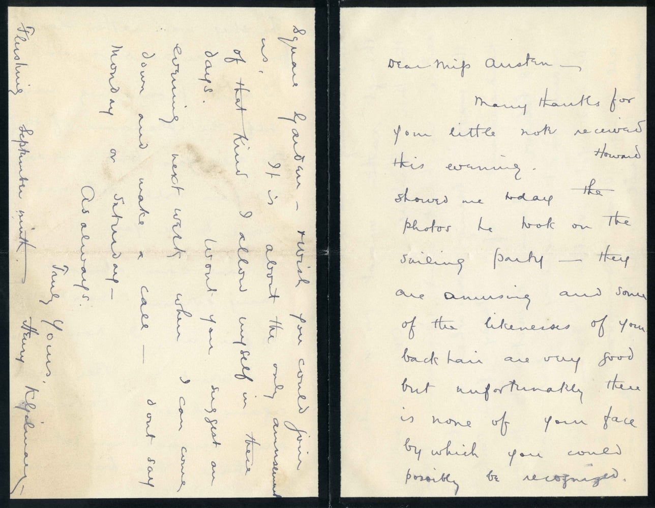 Dear Miss Austin, Many thanks for your little note received this evening. Howard showed me today the photos he took on the sailing party—they are amusing and some of the likenesses of your back hair are very good but unfortunately there is none of your face by which you could possibly be recognized. Sincerely yours, Henry Kipling Flushing September 18th