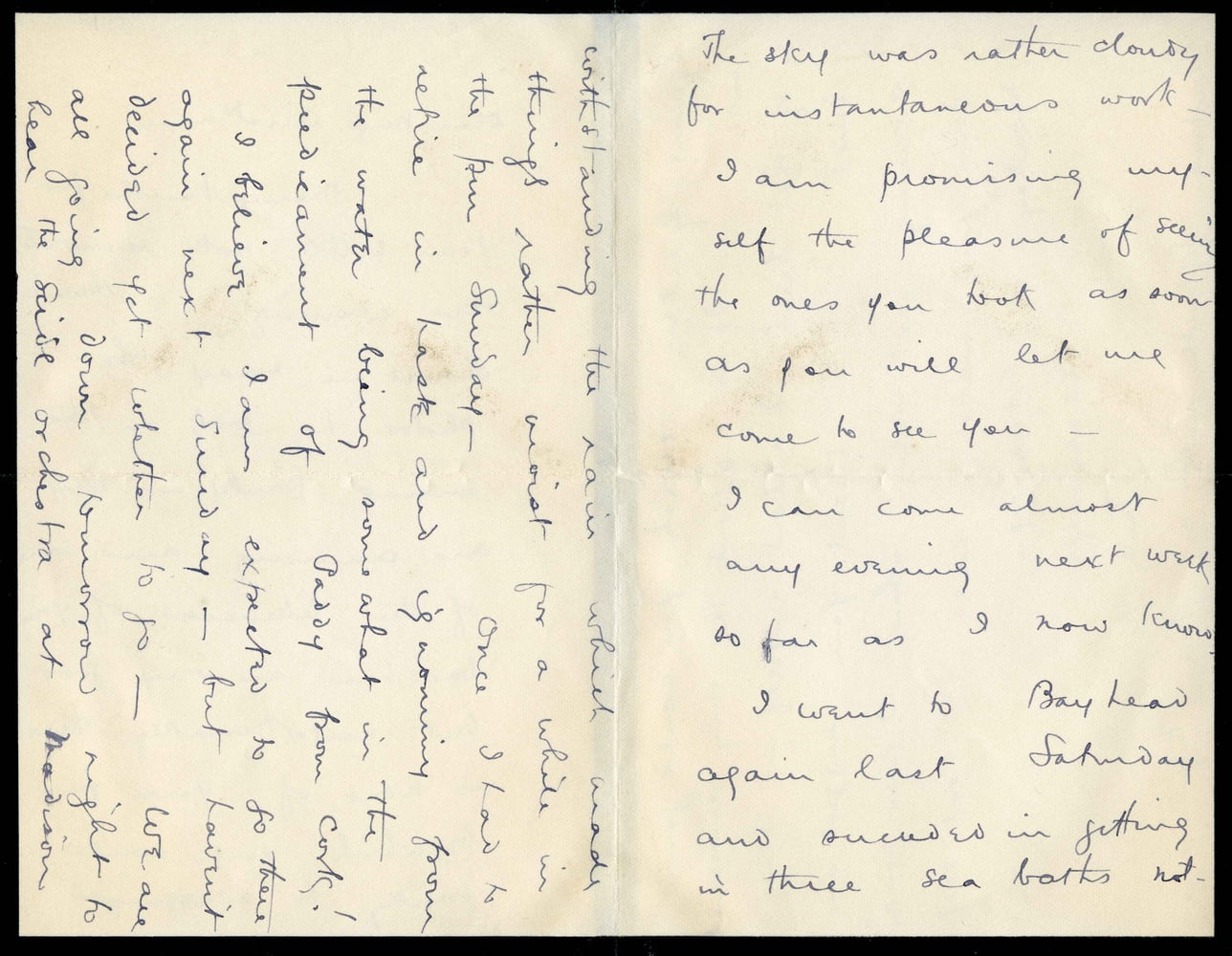 withstanding the rain which made things rather wet for a while in the pm Sunday—Once I had to repile in boat and I morning from the water being somewhat in the flood is amount of Guay from Cork! I believe I am expected to do there again next Sunday any—but haven't decided yet whether to go—or we are all going down tomorrow night to hear the Gise or chorus at Messian. The sky was rather cloudy for instantaneous work—I am promising myself the pleasure of seeing the ones you both as soon as you will let me come to see you—I can come almost any evening next week so far as I now know—I want to Bay Head again last Saturday and succeeded in getting in three sea barks not-