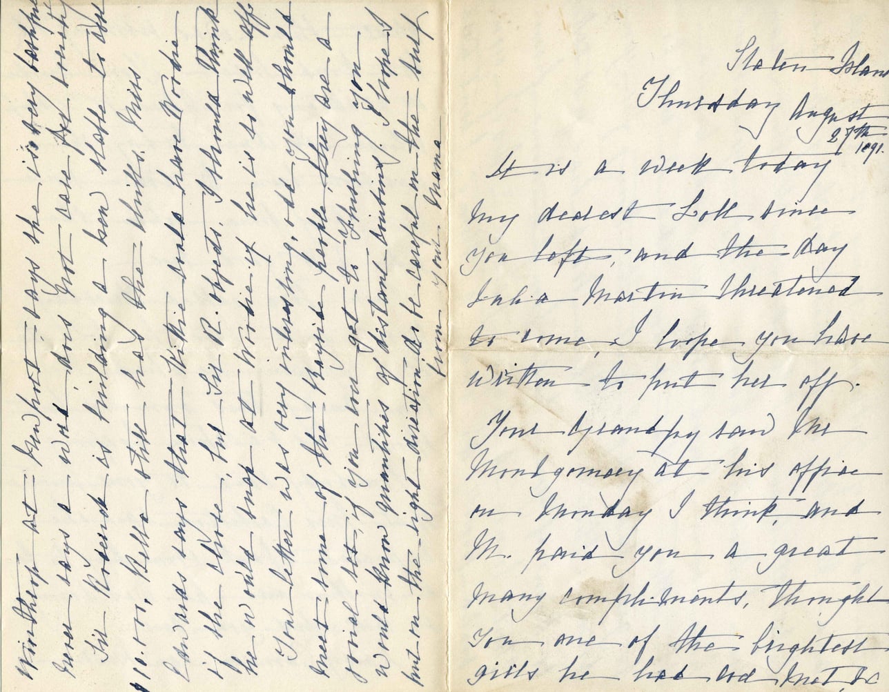 Staten Island Thursday August 29th 1891 It is a week today since you left, and the day Julia Martin threatened to come. I hope you have written to put her off. Your grandpa saw Mr. Montgomery at his office on Monday I think, and he paid you a great many compliments, thought you one of the brightest girls he had ever met.