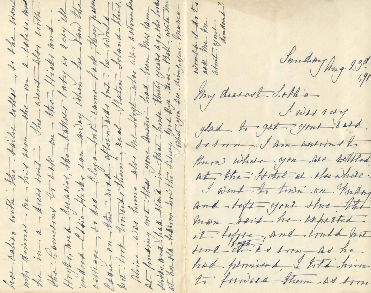 Sunday Aug 23rd, 191 My dearest Lottie, I was very glad to get your note so soon. I am anxious to know where you are settled at the Hotel or elsewhere. I went to town on Friday and left your shoe. The man said he expected it to arrive, and could not send it as soon as he had promised. I told him to forward them as soon her habit with the faith college, & the usual mts. dinners for this term she is a skeptic, and she in a dirty trill. The wind blew the Cameron's off half on the Hicks and Hyde, and against, the baby is very ill indeed. Eddie Hicks has money thrown he has the collapse, to die. Pigs but none folk, they pass Eddie on the road afterwards put the world part trip towards home. Read Hatton Island this shrine was home also, Kate Wright who was afterward finding out that your brother had been fired Sam bricks, and had stood in that house thirty years ago, the book at her old bedroom near the library. Good bye dear friend, write me what you are doing, please. Promise wants it to ask Mr. About you! minden?