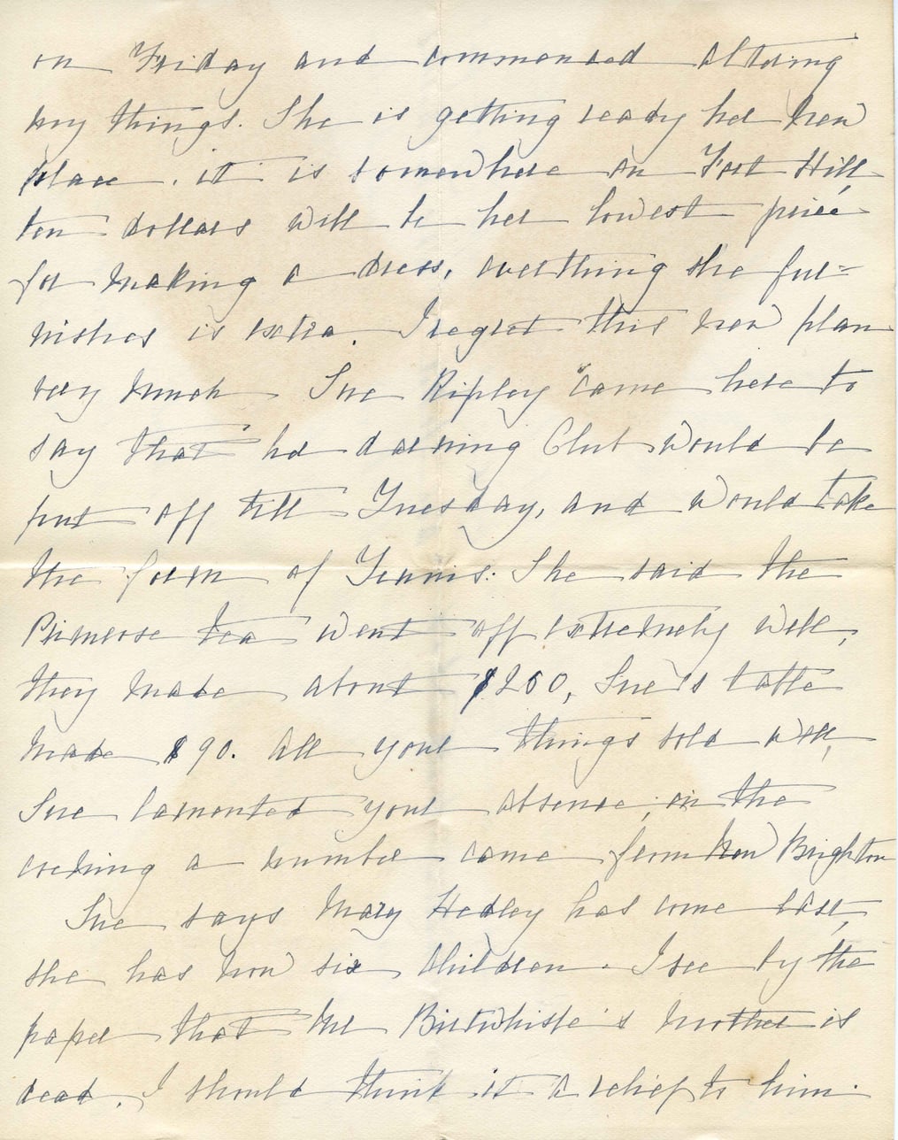 @file_1891_8_27_aug_2003_aca_copy_jpg -> documents -> @letter_1891_08_27_miscon Friday and commenced stuffing my things. She is getting ready to leave soon, place it is somewhere in West Hillton. Dollars will be her lowest price for making a dress, something she felt mistress is useless. I regret this iron plan very much. Sue Ripley came here to say that he darling Clint would be just off till Tuesday, and would take the form of Tennis. She said the Promise Tea went off tolerably well, they made about $200, Sue is talky made $90. All your things till now, Sue lamented your absence; in the evening a number came from Sam Brighton. She says Mary Hedley has come back, she has born six children. I see by the paper that Mr. Birtwhistle's brother is dead. I should think it a relief to him.
