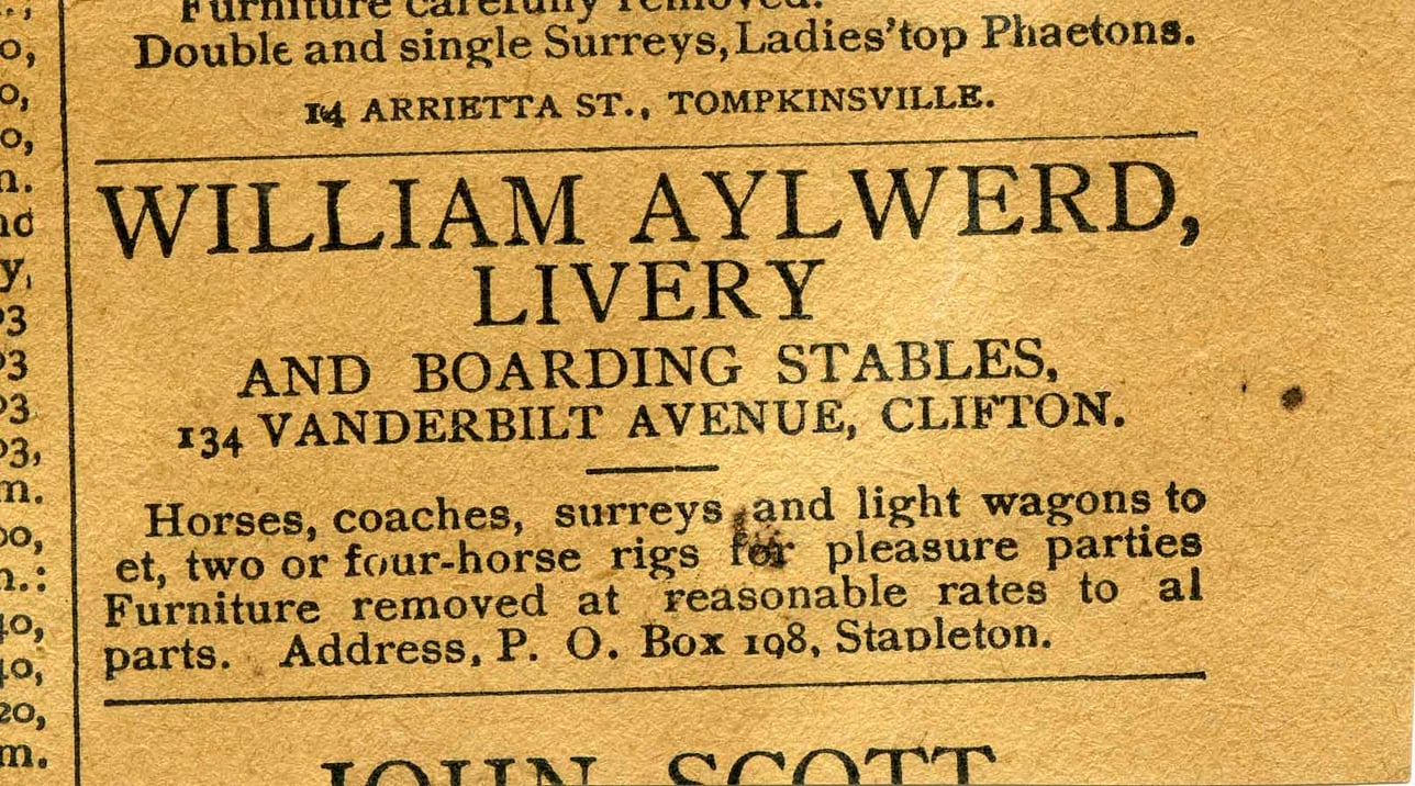 Furniture carefully removed. Double and single Surreys, Ladies' top Phaetons. 14 ARRIETTA ST., TOMPKINSVILLE. WILLIAM AYLWERD, LIVERY AND BOARDING STABLES, 134 VANDERBILT AVENUE, CLIFTON. Horses, coaches, surreys and light wagons to et, two or four-horse rigs for pleasure parties Furniture removed at reasonable rates to all parts. Address, P. O. Box 198, Stapleton.