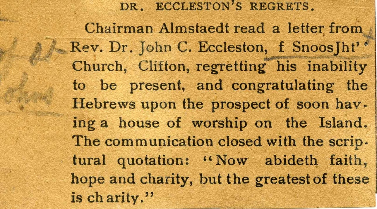 DR. ECCLESTON'S REGRETS. Chairman Almstaedt read a letter from Rev. Dr. John C. Eccleston, f SnoosJht' Church, Clifton, regretting his inability to be present, and congratulating the Hebrews upon the prospect of soon having a house of worship on the Island. The communication closed with the scriptural quotation: "Now abideth faith, hope and charity, but the greatest of these is charity."
