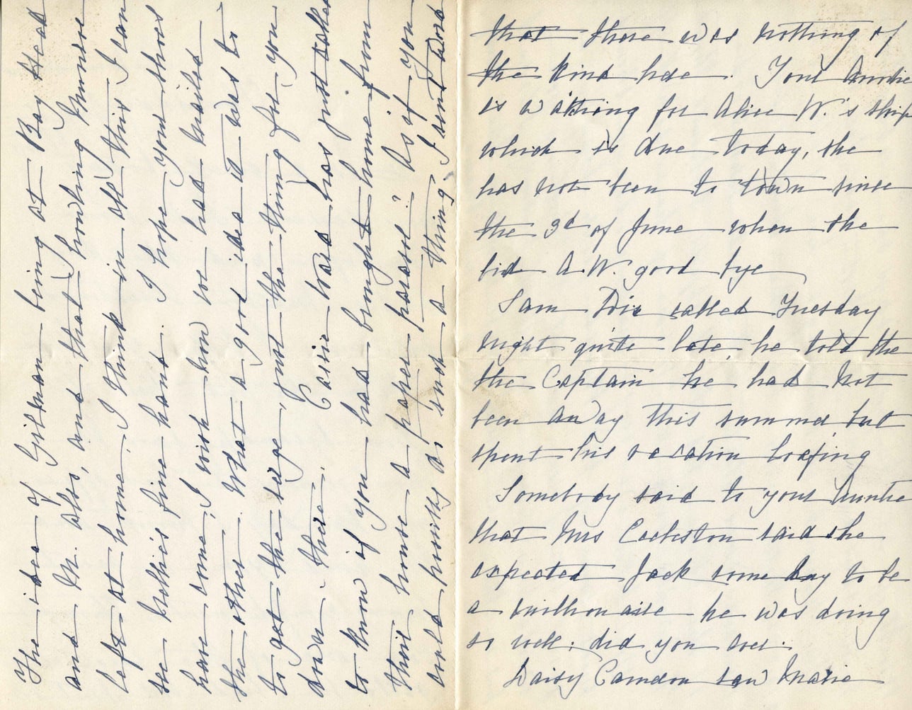 The idea of William being at Hay Head and Mr. Alex, and that Sherlock Holmes left at home. I think in all they have had the happiest fine bank. I hope you will have been; I wish (now) we had heard the other. What a good idea it would be to get the large, great, the thing for you down there. Daisy Ward has just telephoned if you had brought home from there money & paper parcel? Do of you send promptly as much as a thing, I am afraid that there was nothing of the kind here. Your Annie is waiting for Alice W.'s ship which is due today, the has not been to town since the 3d of June when the lid A.W. good bye Sam Prie called yesterday night quite late, he told the the Captain he had last been away this summer but spent his vacation loafering Somebody said to your mother that Mrs. Castleton had she expected Jack some day to be a mistress he was doing so well; did you see Daisy Camden saw Annie