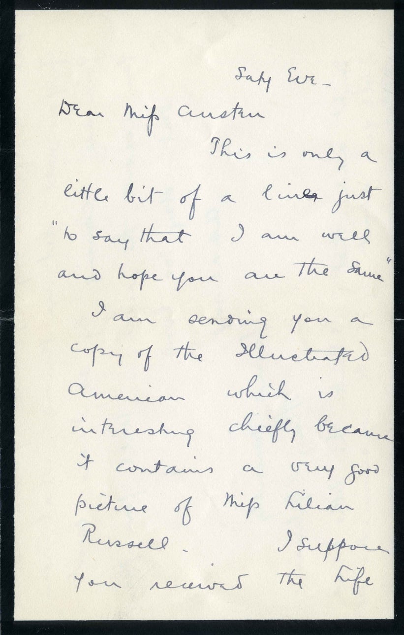 @alice_austen -> recipient of -> @letter_sally_ewSally Ew- Dear Miss Austen, This is only a little bit of a line, just "to say that I am well and hope you are the same." I am sending you a copy of the Illustrated American which is chiefly because it contains a very good picture of Miss Lilian Russell. I suppose you received the Life