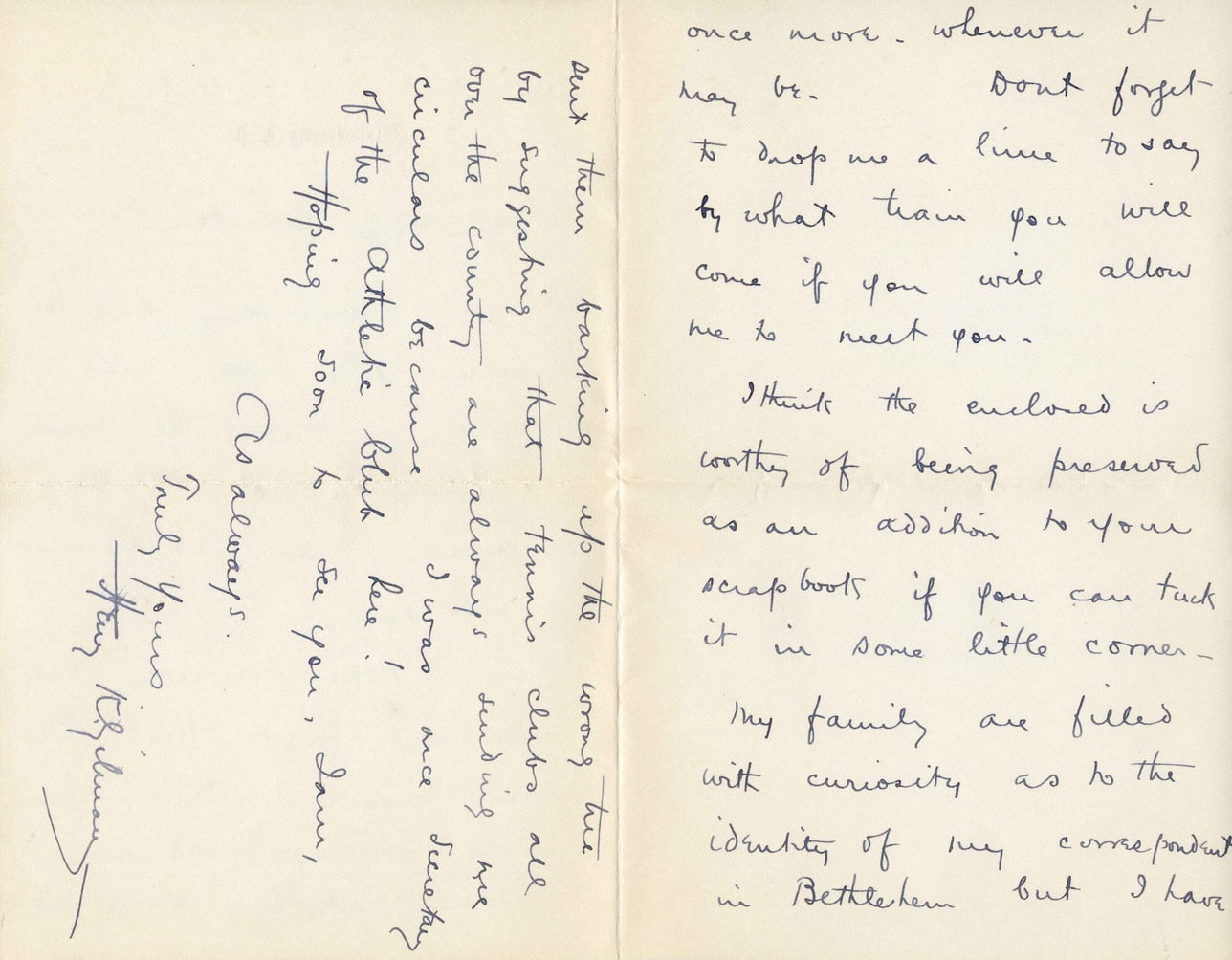 once more. Whenever it may be. Don't forget to drop us a line to say by what train you will come if you will allow me to meet you. I think the enclosed is worthy of being preserved as an addition to your scrapbooks if you can tack it in some little corner. My family are filled with curiosity as to the identity of my correspondent in Bethlehem but I have As always. Truly Yours, Harry H. Pilham