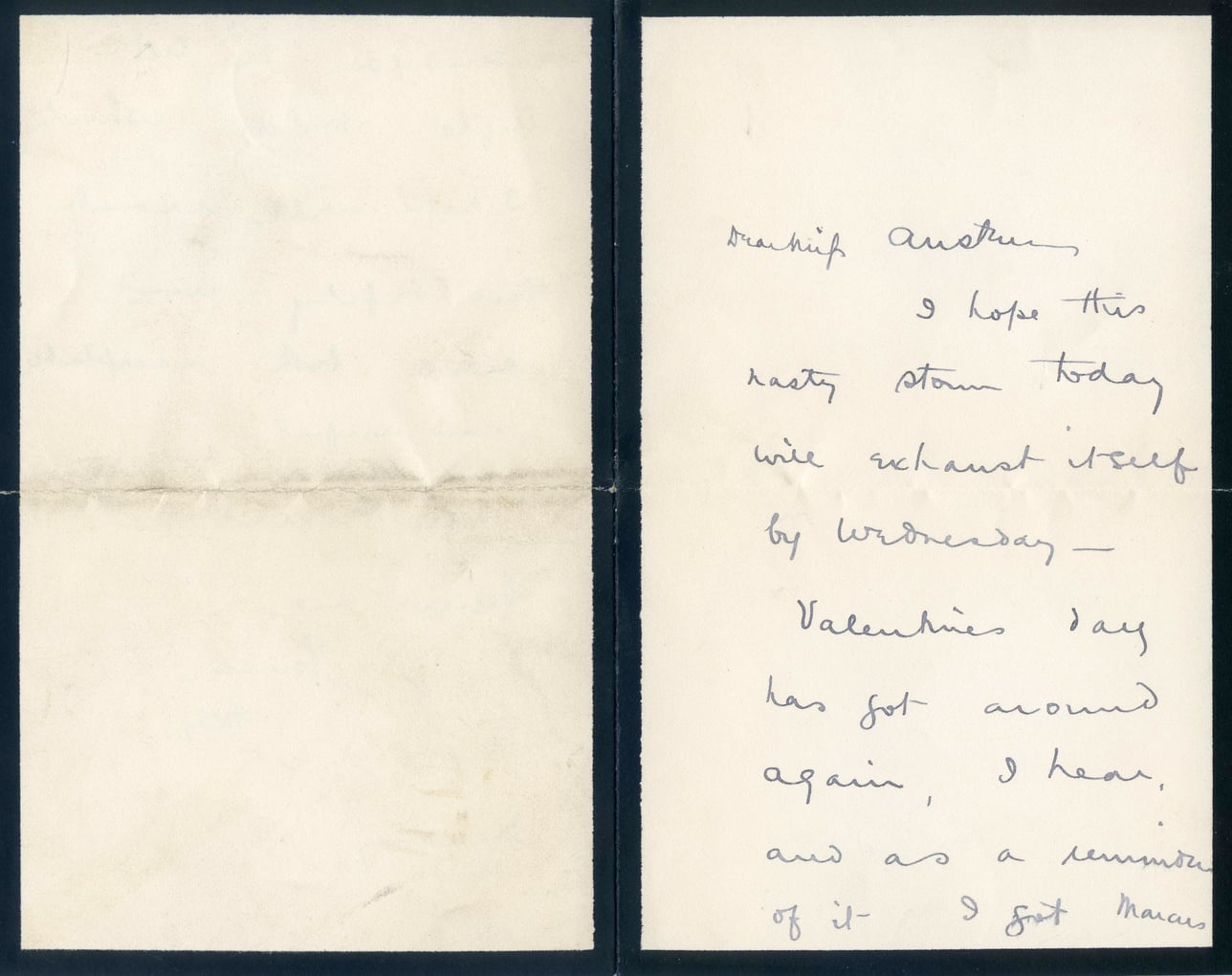 Dear Miss Austin, I hope this nasty storm today will exhaust itself by Wednesday— Valentine's Day has got around again, I hear, and as a reminder of it I got Marcus
