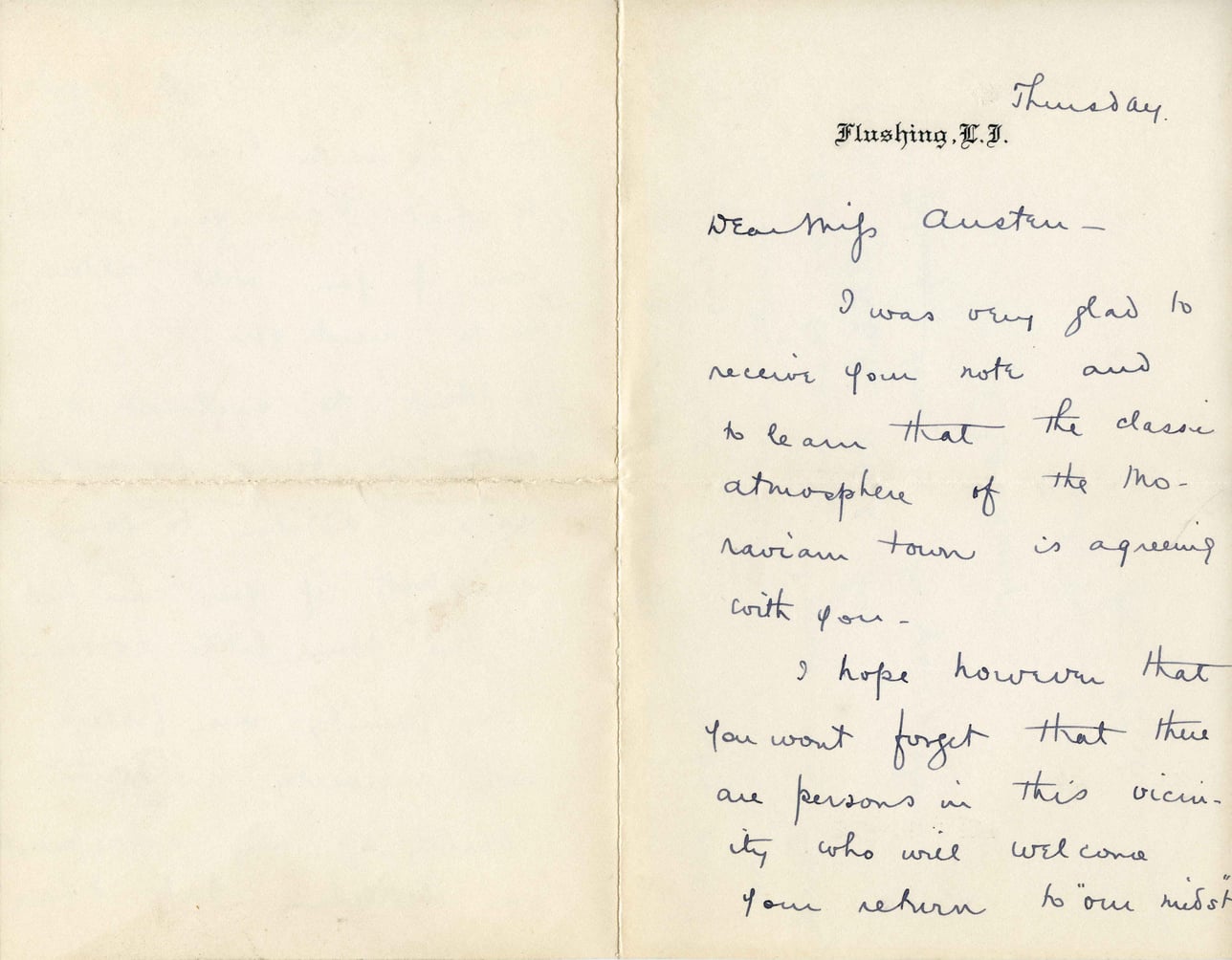 Thursday Flushing, L.I. Dear Miss Austin - I was very glad to receive your note and to learn that the classic atmosphere of the Moravian town is agreeing with you. I hope however that you won't forget that there are persons in this vicinity who will welcome your return to "our midst."