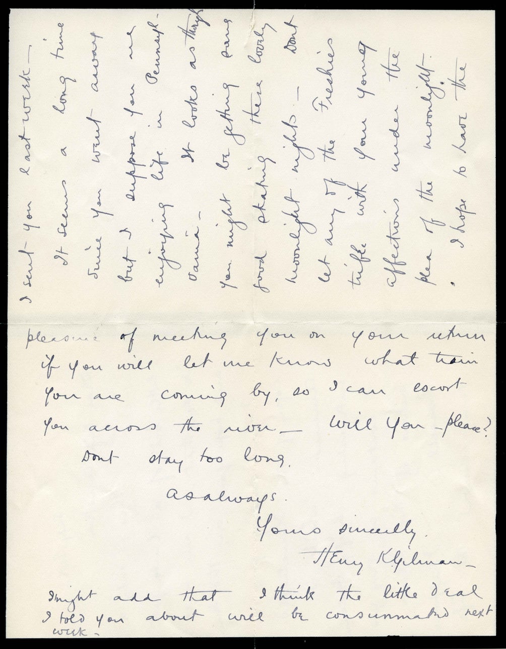 I sent you last week— It seems a long time since you went away but I suppose you are enjoying life in Pennsyl- vania. It looks so happy. You might be getting some good skating there lovely moonlight nights—Don't let any of the Freebies trifle with your young affections under the plea of the moonlight. I hope to have the pleasure of meeting you on your return if you will let me know what train you are coming by, so I can escort you across the river—Will you—Please? Don't stay too long. As always, Yours sincerely, Henry Kgilman— I might add that I think the little deal I told you about will be consummated next week.