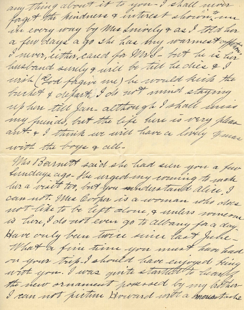 anything about it to you—I shall never forget the kindness & interest shown me in every way by Mrs Smively & as I told her a few days ago she has my warmest affection. I never, either, cared for Mr S—but he is her husband surely & will be till he dies & I wish (God forgive me) he would kick the bucket & depart. I do not mind staying up here till Jan—although I shall miss my friends, but the life here is very pleasant & I think we will have a lovely Christmas with the boys & all. Mrs Barnett said she had seen you a few Sundays ago—the urged my coming to make her a visit too, but you understand Alice. I cannot. Mrs Cooper is a woman who does not like to be left alone, & unless someone is here, I do not even go to Albany for a day. Have only been twice since last June—What a fine time you must have had on your trip—I should have enjoyed being with you. I was quite startled to learn of the new ornament possessed by my brother—I can not picture Howard with a moustache
