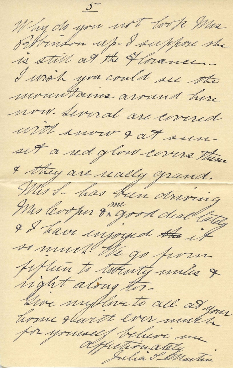 Why do you not look Mrs Robinson up? I suppose she is still at the Florence. I wish you could see the mountains around here now. Several are covered with snow & at sunset a red glow covers them & they are really grand. Mrs J. has been driving Mrs Cooper & me a good deal lately & I have enjoyed it so much! We go from fifteen to twenty miles & right along too. Give my love to all at your home & write ever much for yourself believe me Affectionately Julia F. Martin